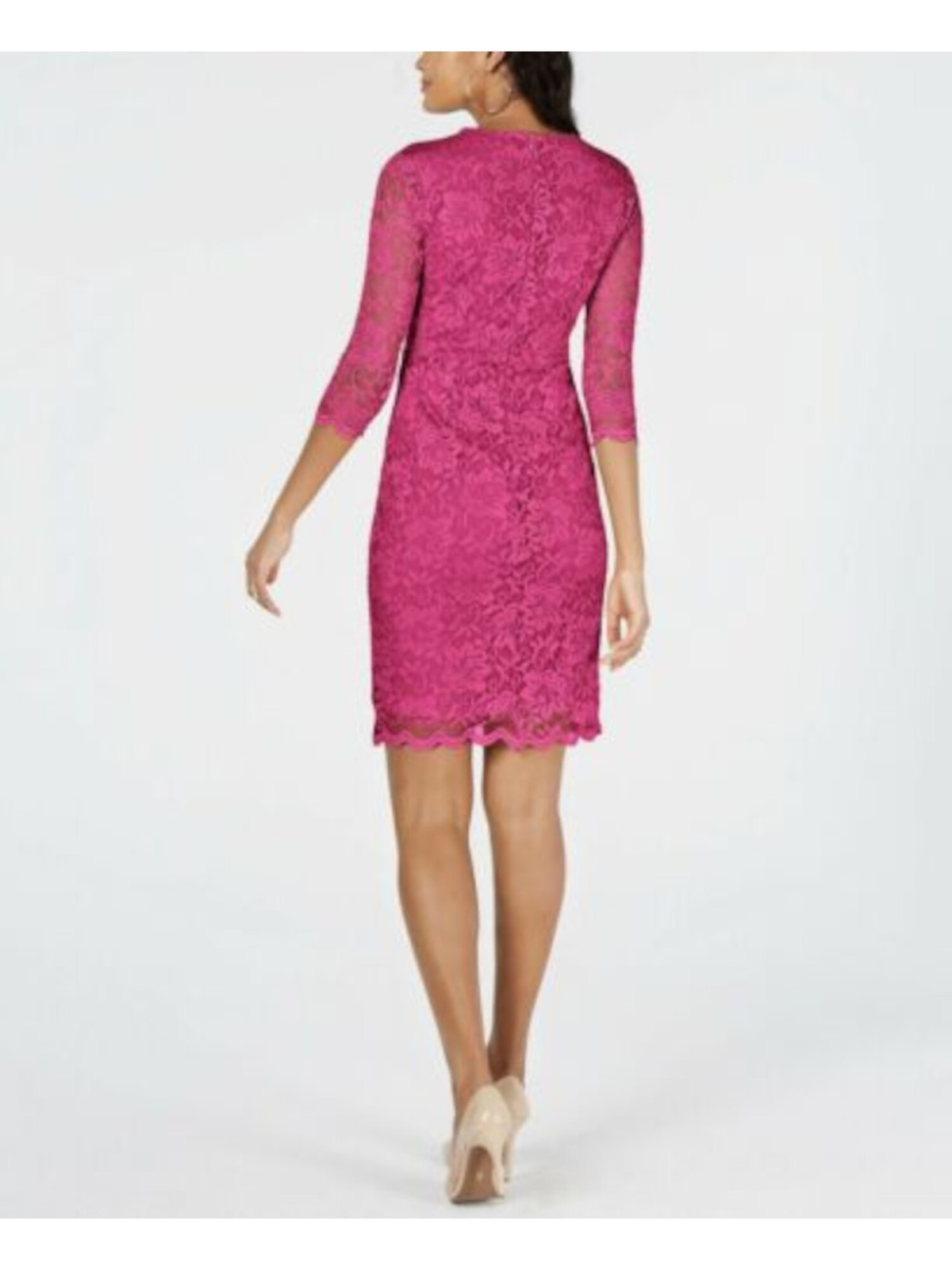 Absolutely love this dress! The pink lace detail is stunning, and the empire waist gives such a flattering fit. Super comfortable stretch fabric, perfect for parties and special occasions. The surplice neckline and 3/4 sleeves add elegant charm—easy to care for, too. A must-have for any wardrobe!