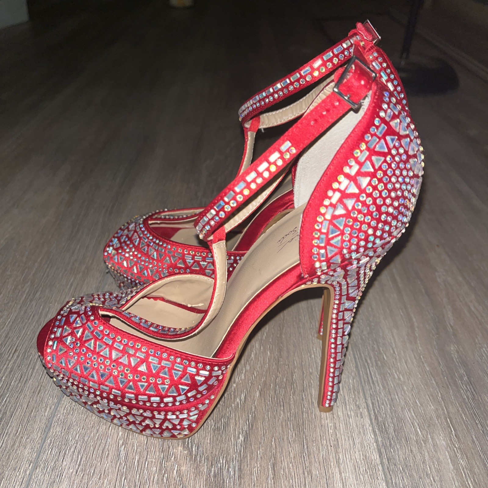 The Thalia Sodi Red Chancey Rhinestone Platform Stiletto Women's Shoes in size 7M feature a peep toe design with a T-strap closure and ultra high stiletto heel. These stylish heels are adorned with rhinestones and a geometric pattern, making them perfect for special occasions like weddings or parties. With a platform height of 3 inches and adjustable ankle strap, these red heels offer both style and comfort. The textile upper and suede lining provide a luxurious feel, while the rubber outsole ensures stability and durability. Designed by Thalia Sodi, these heels are a glamorous addition to any woman's shoe collection.