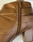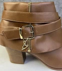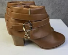 These Thalia Sodi ankle boots are designed for women in a size 8.5 with a stylish camel color and a wedge heel height of 2 inches. The boots feature zip sides for easy wear, straps for added detail, and a round toe shape. They are suitable for various occasions such as travel, parties, casual outings, workwear, or business settings. Additionally, the equestrian and cowgirl themes add a unique touch to the overall design, making them a versatile and fashionable choice for different seasons.