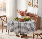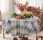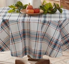 From the Harvest Farmhouse collection by . The Blue Rustic Mountain Plaid Vinyl Flannel Backed Tablecloth is perfect for and year round dining and entertaining throughout the seasons. The Blue Rustic Mountain Plaid Vinyl Flannel Backed Tablecloth is designed to be a favorite for your busy home, kitchen or dining room table or restaurant. The Blue Rustic Mountain Plaid Vinyl Flannel Backed , and Fall Tablecloth is a country rustic pattern that features a medium scale plaid in rust, stonewashed blue and rust on a white colored background. Great for use with adults and children for , Fall and at home or in commercial settings. Perfect for decorating and keeping your kitchen or dining room table protected from everyday accidents. Like plastic, the easy-care vinyl surface can be wiped clean with a damp cloth or sponge. Vinyl top layer adds a protective waterproof layer. Flannel backed to reduce skidding and slipping on most surfaces. Finished with sewn edges. Easy to fold and store when not in use. Great for indoor, outdoor, home, and commercial use alike, the Blue Rustic Mountain Plaid Vinyl Flannel Backed Tablecloth is available in a large selection of sizes and shapes for all of your holiday entertaining needs. Sizes available are: 52 x 52 Square, 52 x 70 Oblong, 60 x 84 Oblong, 60 x 84 Oval, 60 x 102 Oblong, 60 x 120 Oblong and 70 Round. Blue Rustic Mountain Plaid Vinyl Flannel Backed Tablecloth - Stonewashed Blue and Rust Country Plaid Easy Care Vinyl Tablecloth, 70” Round SIZING: 70" Round (178cm) - Fits round tables from 20 Inch x 58 Inch Diameter and Seats 4 to 6 People - Round STYLING: The Blue Rustic Mountain Plaid Vinyl Flannel Backed , and Fall Tablecloth is a country rustic pattern that features a medium scale plaid in rust, stonewashed blue and rust on a white colored background. FEATURES: Beautiful Easy Care Kitchen and Dining Room Tablecloth for Dining, Entertaining, Parties, Picnics, Restaurants and Cafeterias. Indoor and Outdoor Flannel Back Holiday Tablecloths are Easy Care - Just Wipe Clean - No Laundering Needed CARE INSTRUCTIONS:: Vinyl Flannel Backed Tablecloth - For best results use mild soap with damp cloth or sponge on vinyl surface of tablecloth. Do not Iron or machine wash or dry. Materials: Surface 100% Vinyl, Flannel Backing: 100% Polyester