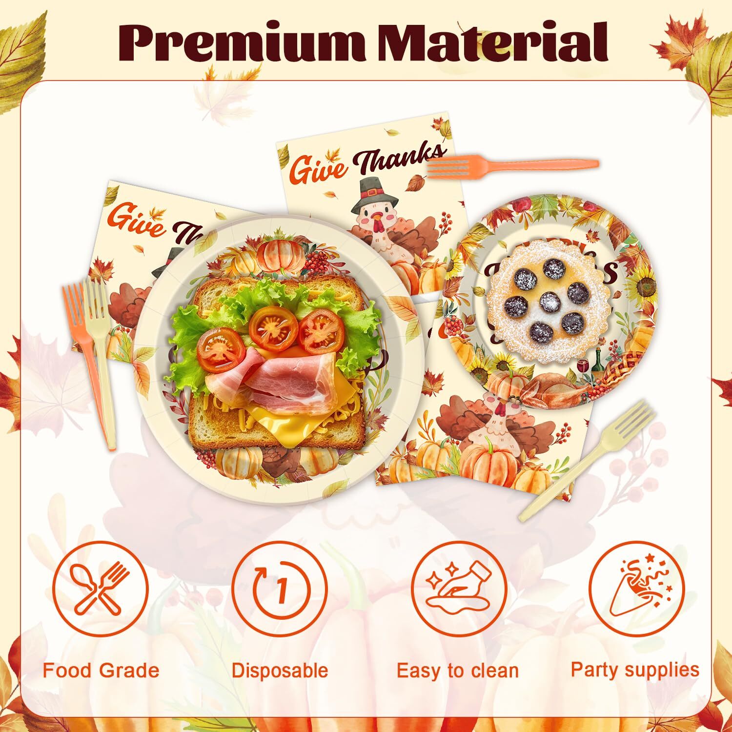 Make Your Thanksgiving Extra Special with This Plates and Napkins Set The Happy Thanksgiving disposable dinnerware set adds the perfect touch to your party, seamlessly complementing other autumn decorations to make your celebration truly unique. Set Includes: 2 pcs 54*108 inch tablecloths 24 pcs 9-inch disposable dinner plates 24 pcs 7-inch paper dessert plates 24 pcs napkins featuring classic Thanksgiving designs 24 pcs forks (2 colors) Features: -Convenient and Disposable: No need to worry about washing up! Made from high-quality cardboard, this tableware is safe, odorless, and durable, protecting your table from scratches and spills. Enjoy every moment of the party with confidence. -Classic Thanksgiving Design: Featuring traditional autumn elements like turkeys, pumpkins, and maple leaves, this set pairs perfectly with other Thanksgiving decorations such as Happy Thanksgiving banners, creating a warm and festive atmosphere that will make your event truly memorable. Bring this stylish and fun Thanksgiving dinnerware set to your party and create lasting memories with family, kids, and friends. Comprehensive Set: The Thanksgiving tableware set includes 24 9-inch disposable dinner plates, 24 7-inch dessert plates, 24 colorful plastic forks, 24 printed napkins, and 2 tablecloths, providing everything you need to serve 24 guests at once. Disposable Convenience: The Thanksgiving dinnerware set offers an easy and hassle-free party experience. Forget about cleaning up—simply toss everything out after use, giving you more time to enjoy quality moments with your kids, family, and friends. Quality Materials: The Thanksgiving dinner plates are crafted from premium quality, thickened cardboard, making them durable and heat-resistant. This ensures a convenient and safe dining experience, allowing you to fully enjoy your party. Stylish and Durable: Featuring classic Thanksgiving elements like turkeys, pumpkins, and maple leaves, the Thanksgiving plates napkins, and tablecloth set is printed with bright, fade-resistant colors, adding joy and lasting memories to your celebrations. Perfectly Coordinated: Thanksgiving party supplies pair beautifully with other fall decorations, to create a warm atmosphere. It’s ideal for any Thanksgiving event, whether it’s a kids’ Thanksgiving party, a family gathering, or a Friendsgiving party.
