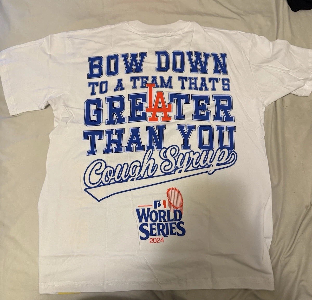 The "That's A Awful Lot of Cough Syrup" T-shirt in white, size medium, features a graphic print design with a crew neckline. Made from cotton jersey fabric, this regular fit T-shirt is machine washable and lightweight, making it suitable for all seasons. The shirt showcases the MLB 2024 World Series ‘LA Dodgers vs. NY Yankees’.