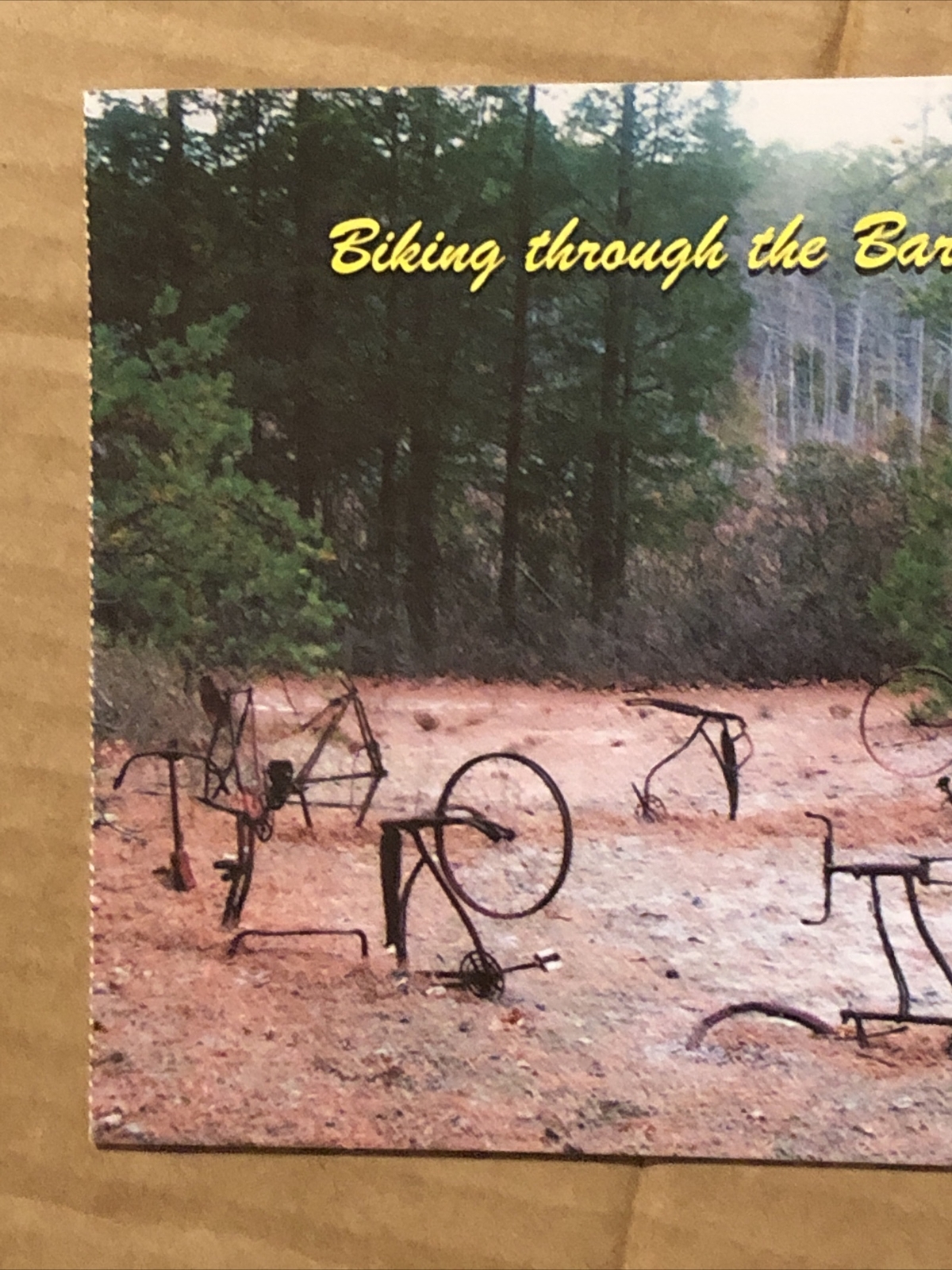 The product is a printed postcard featuring The Barrens, New Jersey's Bikehenge along the Botona Trail near the Bass River. This unique collectible showcases a famous place in North America, specifically in the USA, and captures a specific theme of cities and towns. The postcard measures a continental size of 6 x 4 inches and is an original print from the Chrome era, making it a valuable addition to any collection of topographical postcards or postcards featuring weird and quirky landmarks.