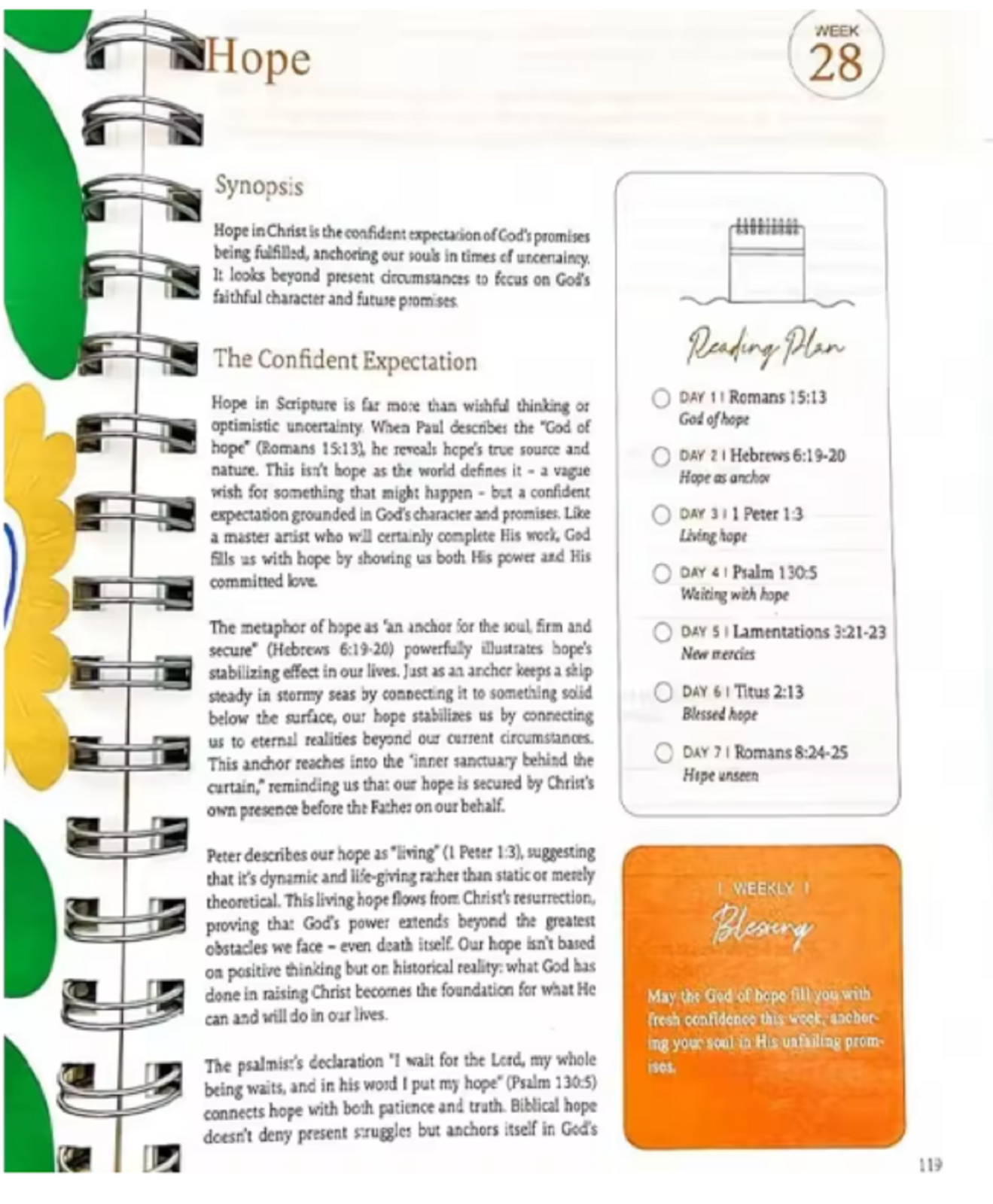 52 Week Spiral Bible Study Guide Workbook The Bible In A Year With Note Taking Space Faith Journal For Women A5 Size 1PC Description : Spiral Binding for Easy Note-Taking : This spiral-bound Bible study journal is designed to lay completely flat, making it easy to write, read, and flip pages during your daily devotion or Bible study sessions. Extra-Wide Margins for Journaling : Ideal for journaling enthusiasts, this 52-week study notebook includes wide margins that give you plenty of space to write notes, prayers, reflections, and key insights while studying the Scriptures. High-Quality No-Bleed Paper : Made from premium-grade paper that prevents ink from bleeding through. Perfect for pens, markers, or highlighters, ensuring a smooth and clean writing experience every time. Guided Weekly Bible Study Plan : Includes thoughtfully selected weekly themes, Bible passages, and reflection prompts to help you connect Scripture with your everyday life and spiritual growth. Weekly Blessings and Encouragement : Each week provides an uplifting blessing and motivational message to inspire and encourage you throughout your 52-week spiritual journey.