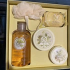The Body Shop Moringa Collection Gift Set 5 Piece Shower Gel Body Butter Scrub. Shower gel 250 mL /body butter 50 mL / exfoliating scrub 50 mL and 3.5 ounce bar soap and loofah.