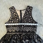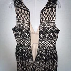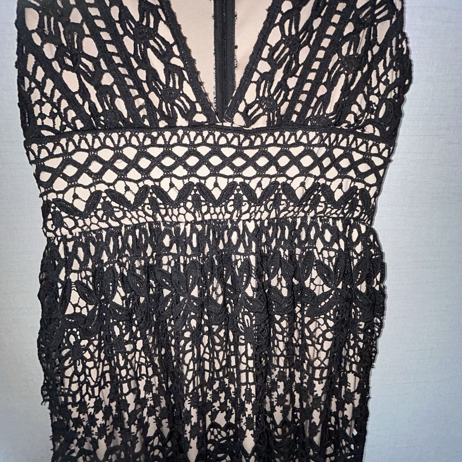 This elegant black maxi dress from The Clothing Company is a stunning addition to any wardrobe. Featuring a beautiful lace pattern, sleeveless design, and a V-neckline, this dress is perfect for formal occasions. The dress is made of high-quality polyester material with a crochet fabric type, making it both comfortable and durable. The dress has a zip closure and is lined for added comfort. It comes in size L . The dress is perfect for all seasons, including winter, summer, fall, and spring. Add this beautiful black maxi dress to your wardrobe today and make a statement at your next formal event!