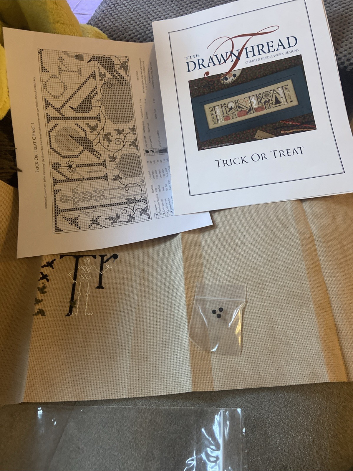 See kit, it has the pattern and was started and a little bag with mini beads or buttons, that might be for eyes or something on the cats so I’m not sure. No thread nice and clean you will get what is pictured.
