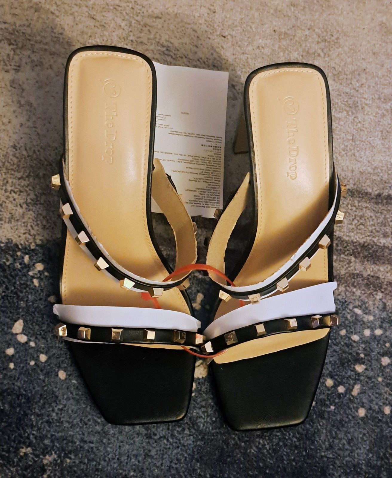 The Drop Women's Avery Square Toe Two Strap High Heeled Sandal in Black is a stylish and contemporary shoe perfect for any woman's wardrobe. With a slip-on design and studded accents, these sandals offer both comfort and a touch of edginess. The mid-height block heel adds a touch of sophistication, making them suitable for various occasions. Made from leather and polyurethane, these sandals are durable and designed to last. The Avery model from The Drop is a must-have for any fashion-forward woman looking to make a statement. Item IS Brand New With Tags Sold As Is No Returns