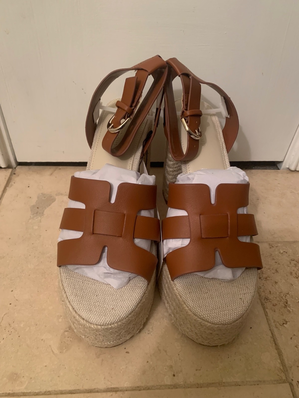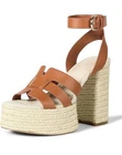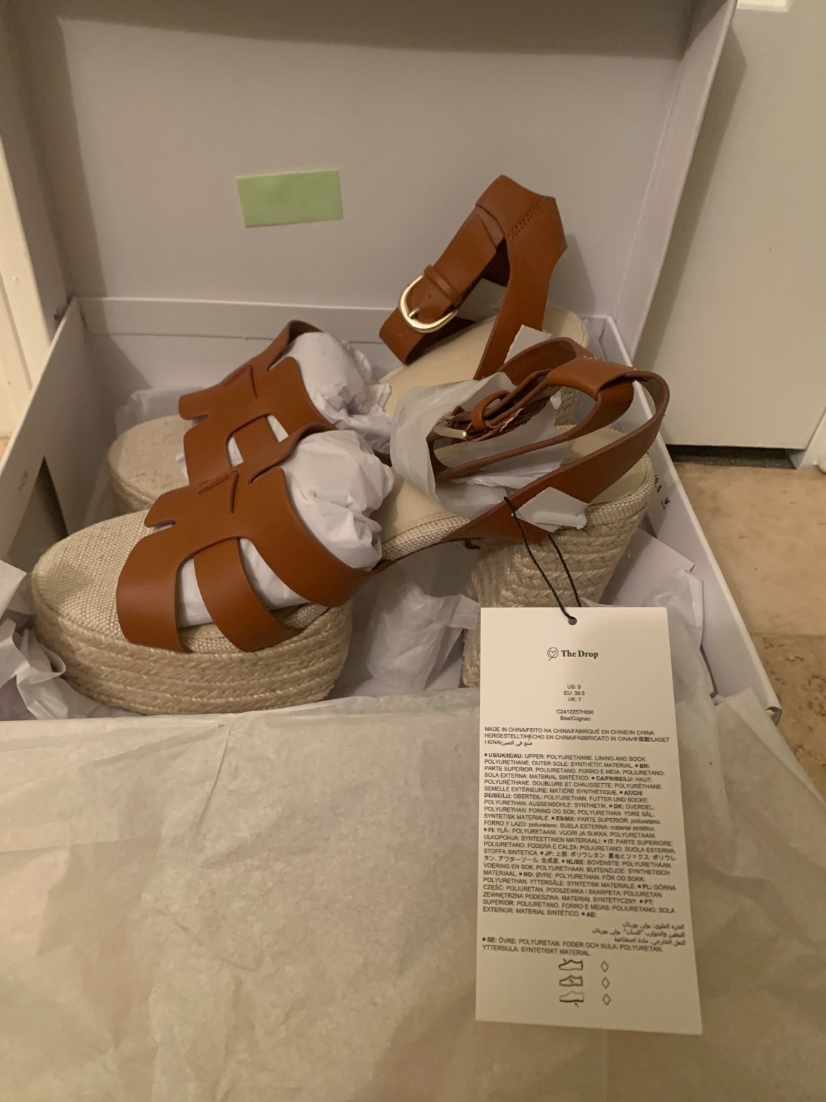 The Drop Women's Size 9 Bea Platform Heel in Cognac is a heeled sandal with a 4.6-inch heel, a round toe, and an elevated woven detail, and it is made of 100% polyurethane. This "Staples by The Drop" item is designed as a versatile wardrobe staple.