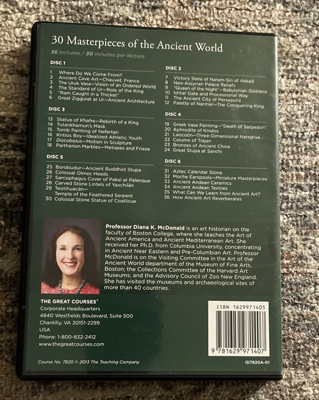 Franchise:The Great CoursesRating:NRSeason:N/ACountry/Region of Manufacture:United StatesStudio:The Teaching CompanyRelease Year:2013Language:EnglishEdition:Box SetGenre:EducationalMovie/TV Title:The Great Courses: 30 Masterpieces of the Ancient WorldFormat:DVDCase Type:Tall/DVD CaseRun Time:18 HoursMPN:PB7820AActor:Professor Diana K. McDonaldType:SeriesSub-Genre:HistoryFeatures:Book Included