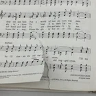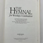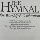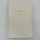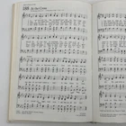 The gold lettering on the cover is beginning to wear away, and the cover is beginning to split at the spine. The binding is in good shape. The book has other general wear and tear, including a ripped page at number 186, the old rugged cross. There is also a church name on the front cover.