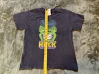 This youth boys' large shirt featuring The Incredible Hulk is a vintage 90s piece perfect for fans of Marvel comics and superheroes. The black shirt with a graphic print of The Hulk is a pullover with short sleeves and a crew neck neckline, suitable for casual occasions like parties and travel. Machine washable and easy to care for, this regular fit t-shirt is ideal for the summer, fall, and spring seasons, making it a versatile addition to any young superhero's wardrobe.