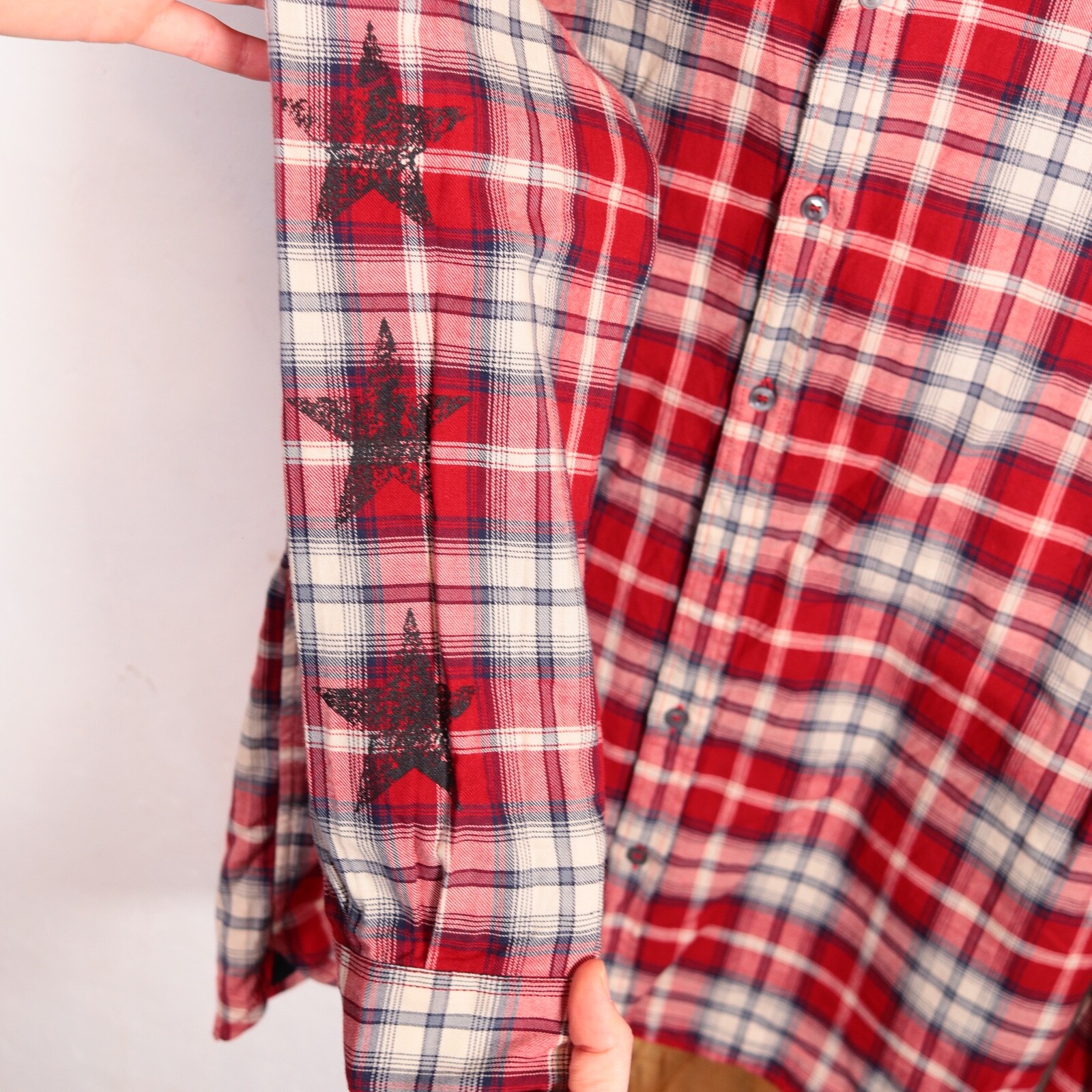 The Kooples Moonlight Plaid Fitted Button Up Shirt Star Print Sleeves Size Small The Kooples - Moonlight collaboration series Button up fitted shirt in a red, white and black plaid pattern Featuring a 3 star print design on each sleeve Branded buttons TK branded piece between the front and back hems 100% cotton Men’s size small Please note: the fifth button down is unfortunately missing, and there are no spare buttons so I have not replaced it. I would suggest using the top button to replace it, and having no top button or an alternative one. MEASUREMENTS (Flatlay, approx): -Chest (pit to pit): 20.5 inches / 52 cm -Length: 25.75 inches / 65 cm -Sleeve (from underarm): 19.75 inches / 50.5 cm Most of our items are sent in 100% bio-degradable, recyclable mailing bags, or sometimes re-used packaging, to help the planet. UK shipping is Royal Mail Tracked 48 so you can keep up with the progress. Any questions, please ask - I normally reply within a few hours. Also, happy to consider offers.