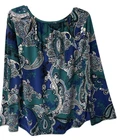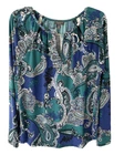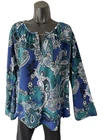 ••• FLAWLESS Condition…No Signs of Wear! *Some Photos may appear a slightly different color on different devices. ••• Please note the below measurements!! ••• APPROX. MEASUREMENTS BUST: Flat Lay, Non-Stretch Pit to Pit: 22” LENGTH: Shoulder to Hem: 28” If you have any questions, please don’t hesitate to contact me! *** I offer combined shipping discounts in order to save my customers on postage charges when purchasing multiple items! Elevate your wardrobe with this stunning paisley print blouse from The Limited. The blouse features a split V-neckline with a chain accent and a keyhole neck that adds a touch of elegance to your outfit. The long sleeve blouse is made from a stretchy knit material of polyester and spandex that feels comfortable on your skin while still flattering your figure. This classic fit blouse comes in the size XL and is perfect for a variety of occasions such as travel, casual outings, parties, business meetings, and more. The blouse is machine washable, which makes it easy to care for. The teal, blue, black, and white color combination of the blouse is perfect for the fall, winter, and spring season. Add this designer blouse to your collection and bring a colorful and timeless touch to your wardrobe.