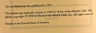 This is a 1998 hardcover edition of "The Lost World" by Arthur Conan Doyle. The book was written in 1912; this edition was "especially created" by the Book of the Month Club in 1998. Please note that this is not the novel, with the same title, written by Michael Crichton (Mr. Crichton borrowed the title for one of his "Jurassic Park" novels). This is an attractive edition, with an early 20th-century look and feel, which includes illustrations. The novel is an adventure tale - a quest to reach a remote area (in South America) where animals (including dinosaurs), considered to be long extinct, are rumoured to still be living.