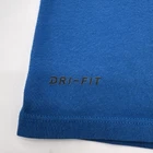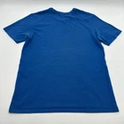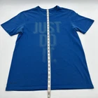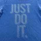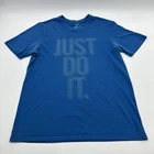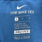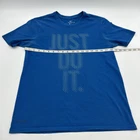 The Nike Tee Dri-Fit T-Shirt for Men in size Medium is a blue shirt featuring a graphic print logo. Made from a blend of polyester and cotton, it has a crew neck and short sleeves, offering a regular fit suitable for all seasons. This classic sports-themed shirt is designed by Nike and is perfect for the spring season. Check pictures for flaws and measurements