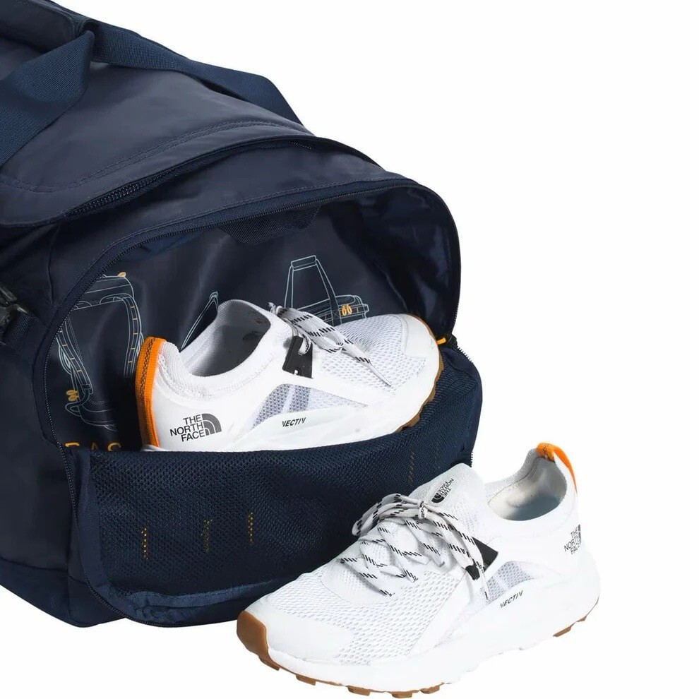 In excellent condition, almost new , gently used few times only. Originally $155. The North Face Base Camp Voyager 62L Duffel is a game-changing update to the iconic Base Camp Duffel. Sized for multi-day trips, it now includes more internal organization and a 100%-recycled body material that is lighter than the original but just as durable. The Base Camp Voyager 62L features an Internal, secure-zip pocket to hold small essentials, comfortable, padded shoulder straps that unclip and conceal behind the back panel so you can carry it as a backpack or duffel, and an adjustable divider in the main compartment lets you position your gear, or you can remove the divider completely. This North Face Voyager Duffel was fashioned with Lightweight, 100% recycled, durable fabric, and it has a small, external, secure-zip pocket for quick-access items such as a passport. The North Face Bace Camp Voyager 62L Duffel is a great choice for on the go adventure. Key Features Water-resistant ID window on side Side handles cause the duffel to sit away from your body so it doesn’t swing into your side when you’re walking Adjustable divider in the main compartment lets you position your gear, or you can remove the divider completely Comfortable, padded shoulder straps unclip and conceal behind the back panel so you can carry it as a backpack or duffel 300D recycled polyester tarpaulin with non-PFC durable water-repellent (non-PFC DWR) finish