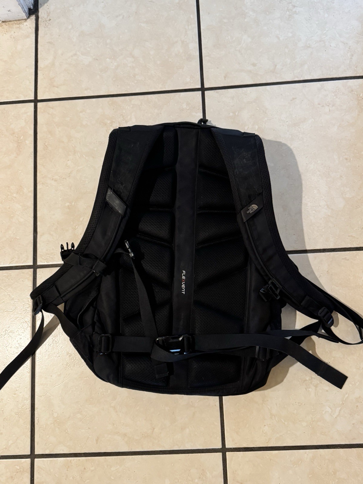 The North Face Borealis Backpack in Black is a medium-sized backpack perfect for travel, casual outings, or workwear. This solid black backpack features a zip and buckle closure, a top handle style, and is made of durable polyester material with a canvas lining. It includes practical features like a lined interior, bottle pocket, padded notebook sleeve, and multiple pockets for organization. This unisex backpack from The North Face is designed for school themes and offers both style and functionality for everyday use.