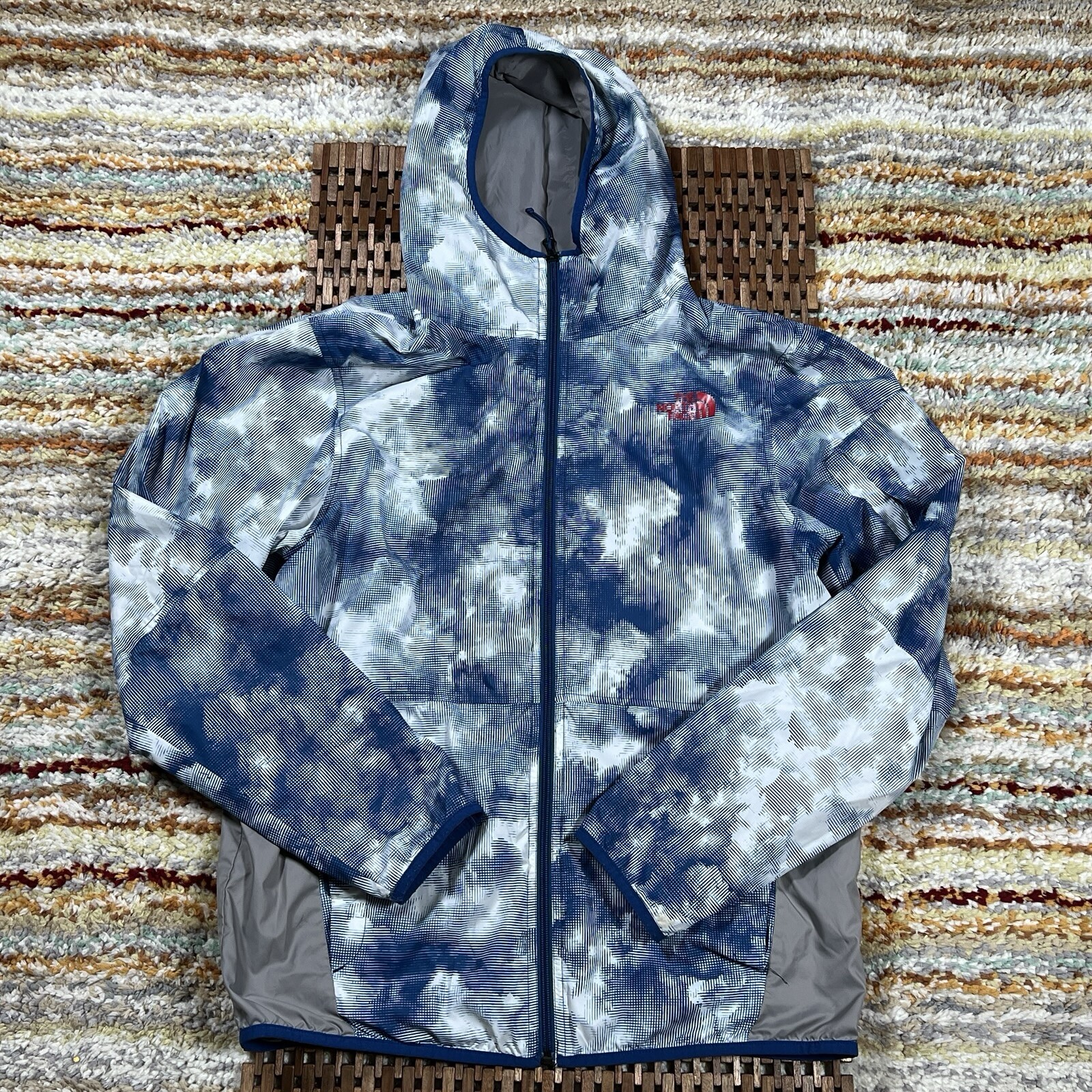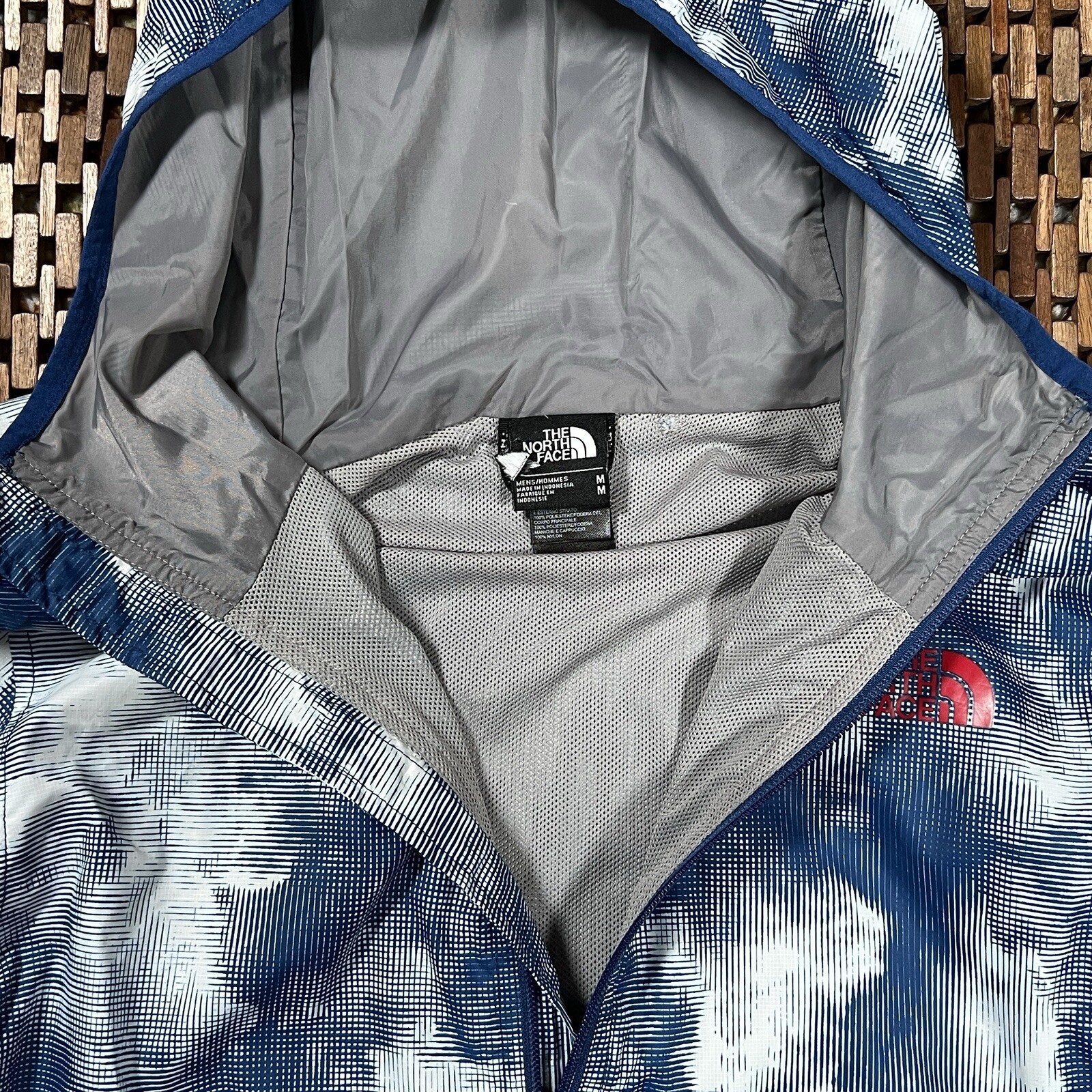This is a men's blue jacket by The North Face, featuring an all-over print design. The jacket is made of polyester softshell fabric with a polyester lining, has a zip closure, and includes velcro pockets and the brand's logo accents. It is a lightweight and water-resistant jacket suitable for casual wear in summer, fall, and spring, ideal for activities like walking, hiking, and running & jogging.