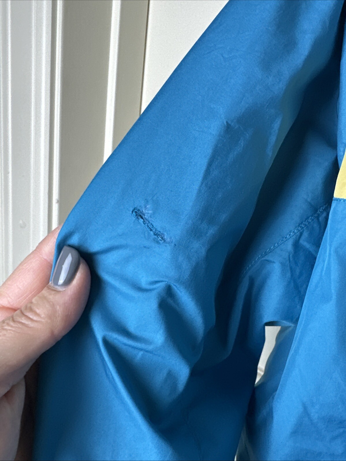 There is a rip on back of left arm. It does not go through mesh inside.