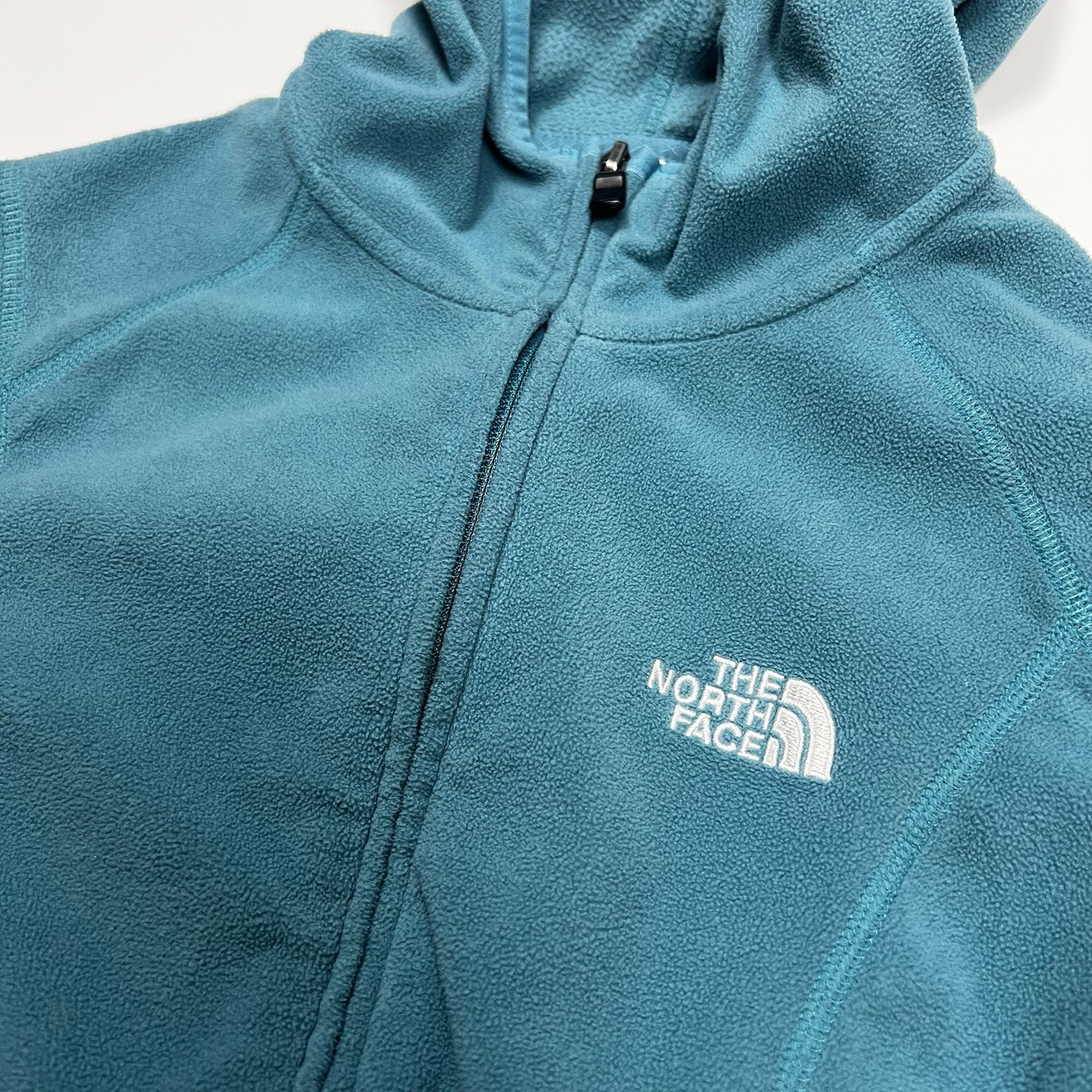 This product is a stylish The North Face jacket in a size small. It features a beautiful blue and green teal color combination, making it perfect for adding a pop of color to your wardrobe. The full zip design and fleece fabric make it both fashionable and cozy, while the logo accents add a touch of detail. Designed for women, this basic jacket is a versatile choice for everyday wear.