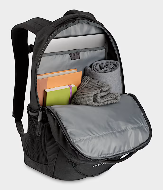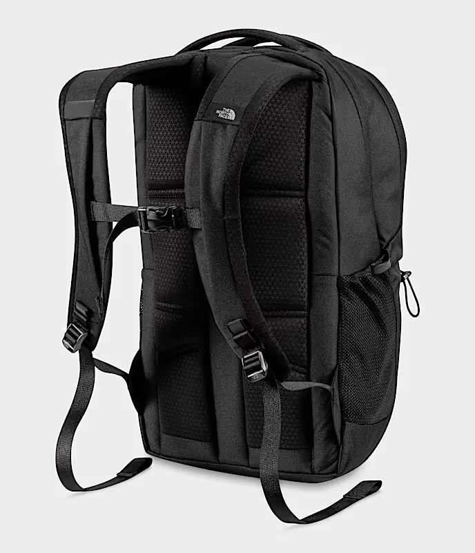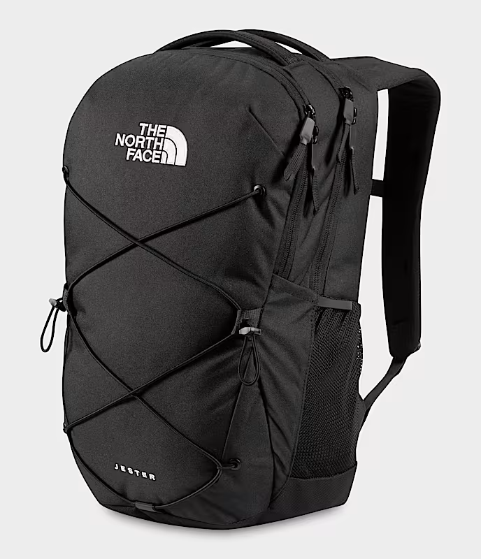 Product Details A classic look with contemporary comfort, the Jester backpack from The North Face gives you an innovative suspension system of molded straps and a breathable padded back. Inside, there's protection for a laptop plus organization for other essentials. Product Features Exterior Dimensions: 19.75" x 13.25" x 7.5" Interior: padded 15" laptop sleeve; zip pocket; stay-put pocket closure; pen pockets Exterior: elastic bungee at front for storage; FlexVent™ suspension with padded mesh back panel; water bottle pockets; reflective bike-light loop; sternum strap with whistle bucket Handles: custom injection-molded shoulder straps with webbing; padded top haul handle Weight: 2.01lbs Warranty: manufacturer's lifetime warranty Includes certified recycled materials [100% Recycled Polyester] Polyester Spot clean Imported