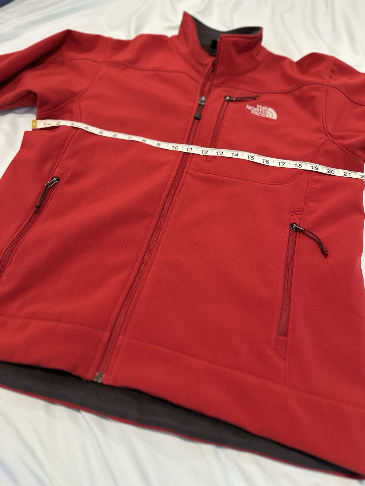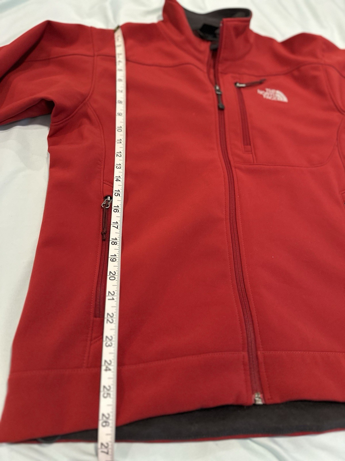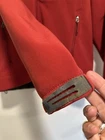 The North Face Mens Medium Apex Bionic Softshell Deep Red Full Zip Jacket. Hand warmer zip pockets. Single zip Chest pocket. Adjustable cuffs. Drawstring waist. Excellent used condition. No rips, stains or defects. Please see pictures for measurements.