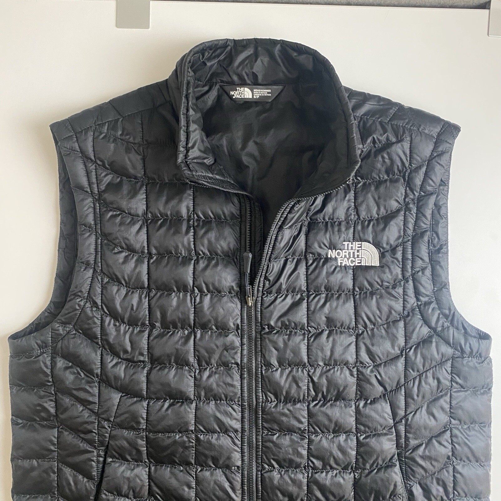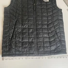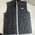 Very good preowned condition. This is a men's black puffer vest by The North Face, designed for outdoor activities like hiking and skiing. The quilted vest is insulated with polyester Thermoball material, suitable for winter, summer, fall, and spring seasons. It features a full zip closure, embroidered logo accents, and a size S fit. The Gorpcore style combines functionality and fashion, making it a versatile piece for travel or casual wear. Made with nylon outer shell and lining, this vest is machine washable and ideal for those seeking a rugged, outdoor-inspired look.