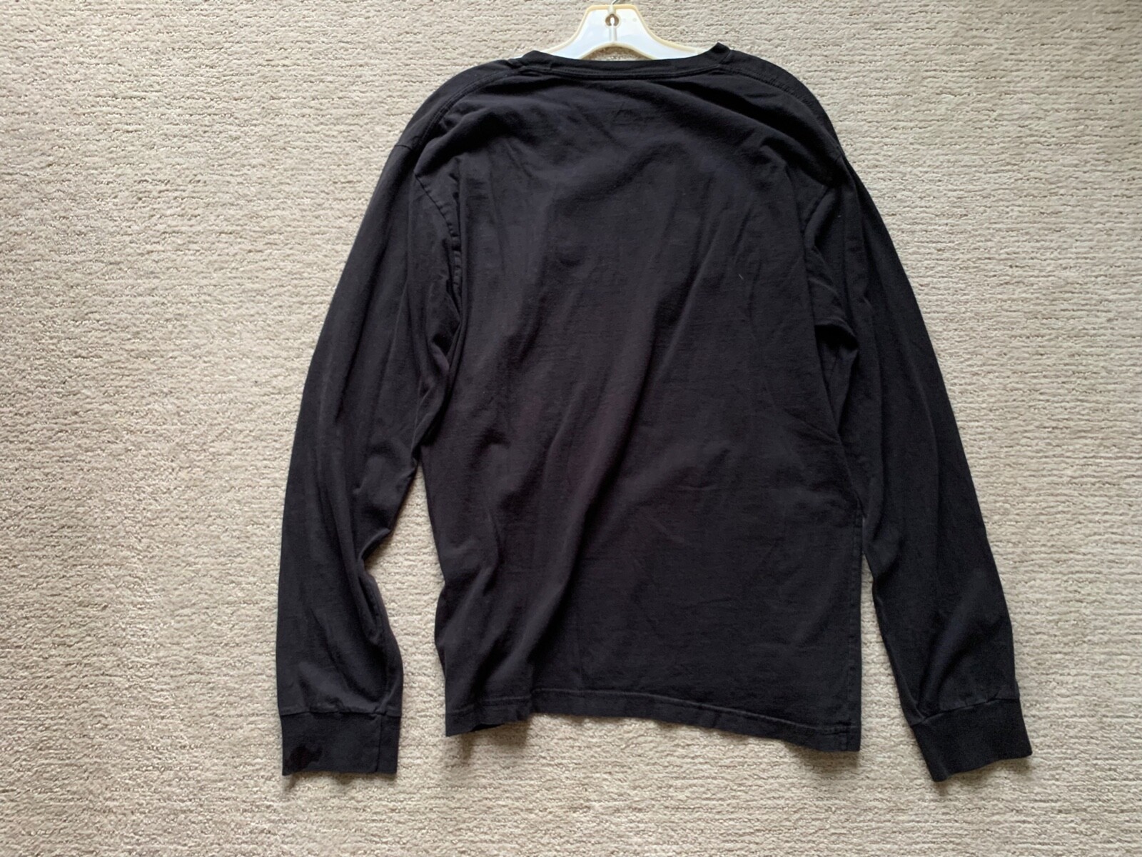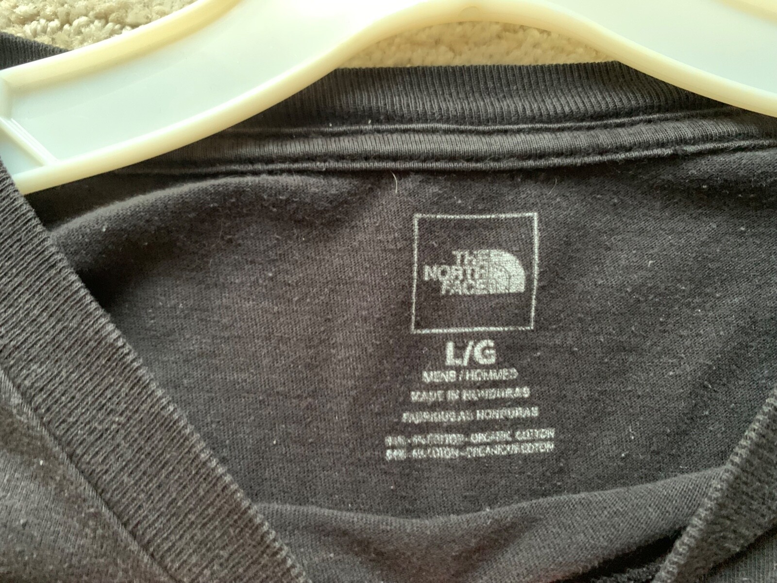 This is a men's black long sleeve T-shirt by The North Face in a classic fit, made of 100% cotton jersey fabric. It features a round neck and a logo accent. The T-shirt is designed for casual wear and offers comfort, suitable for the summer and spring seasons. Note imperfection on sleeve.