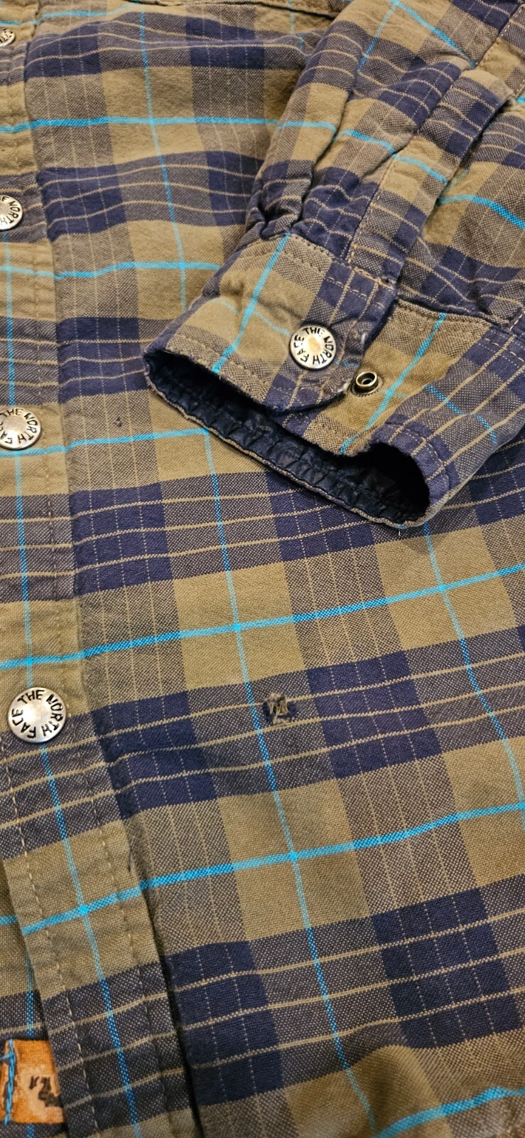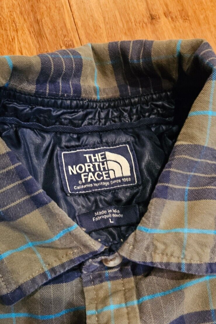 This is a men's Large green flannel jacket from The North Face, designed for outdoor activities in colder seasons. The mid-length jacket features a plaid pattern, button and snap closures, and a nylon lining for added warmth and comfort. With a regular fit and insulated design, this overcoat is suitable for travel, casual wear, walking, and hiking. The jacket also includes accents like logo detailing and a quilted appearance, making it a stylish and functional choice for nature lovers looking for a colorful and versatile outerwear option. This is a pre-owned TNF insulated flannel. The shirt jacket has regular wear and tear and is still in good condition. There is a small hole visible in pictures towards the bottom hem of the shirt on the front. No other noticeable flaws. Refer to the measurements shown both below and in photos for a more detailed guide on sizing. It is recommended to compare measurements to a similar article of clothing that you own that fits you well. Measurements- Chest: 21.5 inches (pit to pit) Length: 27 inches (top of collar to bottom hem)