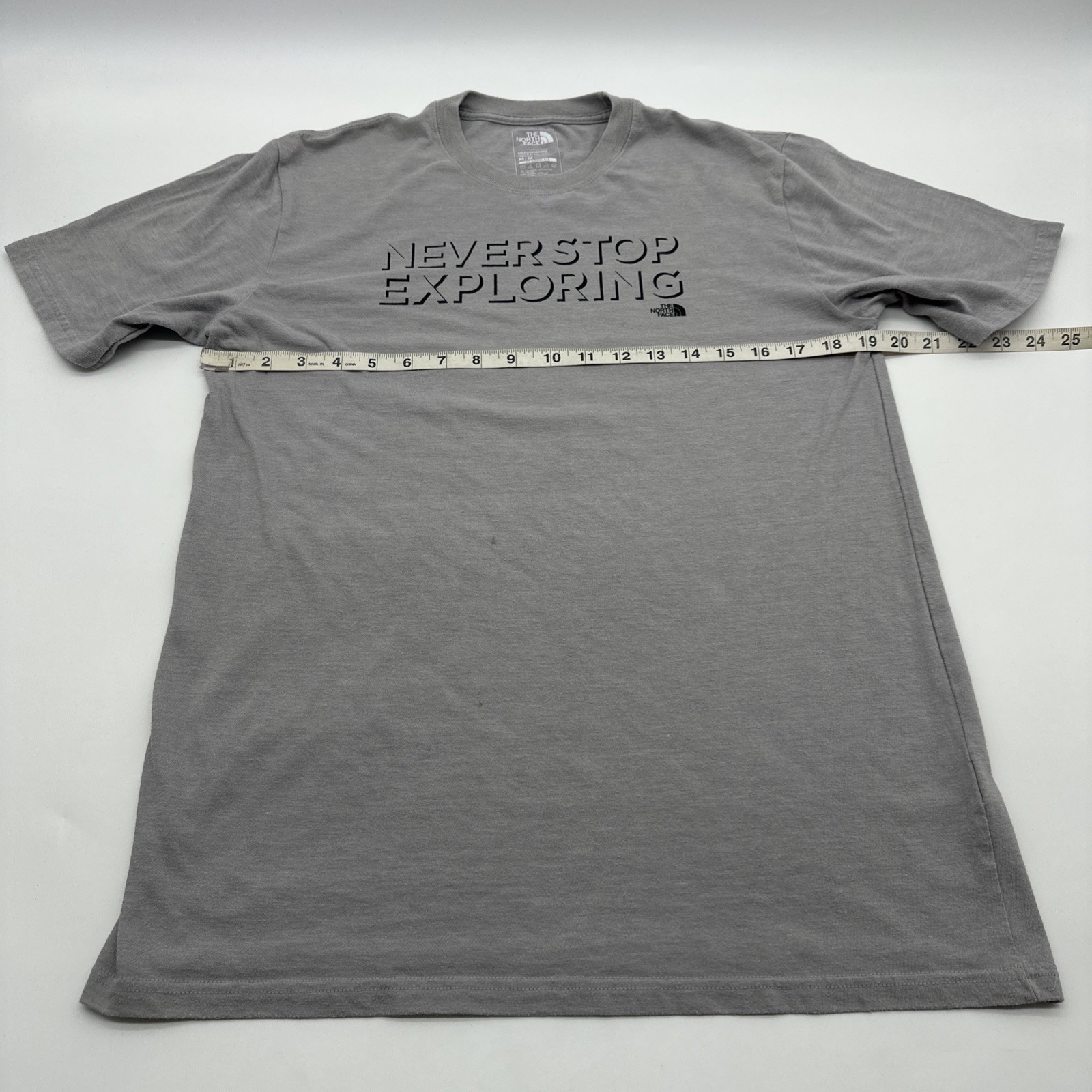 The North Face Classic Fit T-Shirt for men in size M is a stylish and versatile piece perfect for outdoor enthusiasts. Made from a blend of polyester, viscose, and cotton, this gray t-shirt features a classic graphic print logo accent that adds a touch of sporty flair. With a comfortable crew neck and short sleeves, it is ideal for wearing in the summer, fall, or spring seasons. Whether you're hitting the trails or just running errands, this t-shirt from The North Face is a must-have for any man's wardrobe. Check pictures for flaws and measurements
