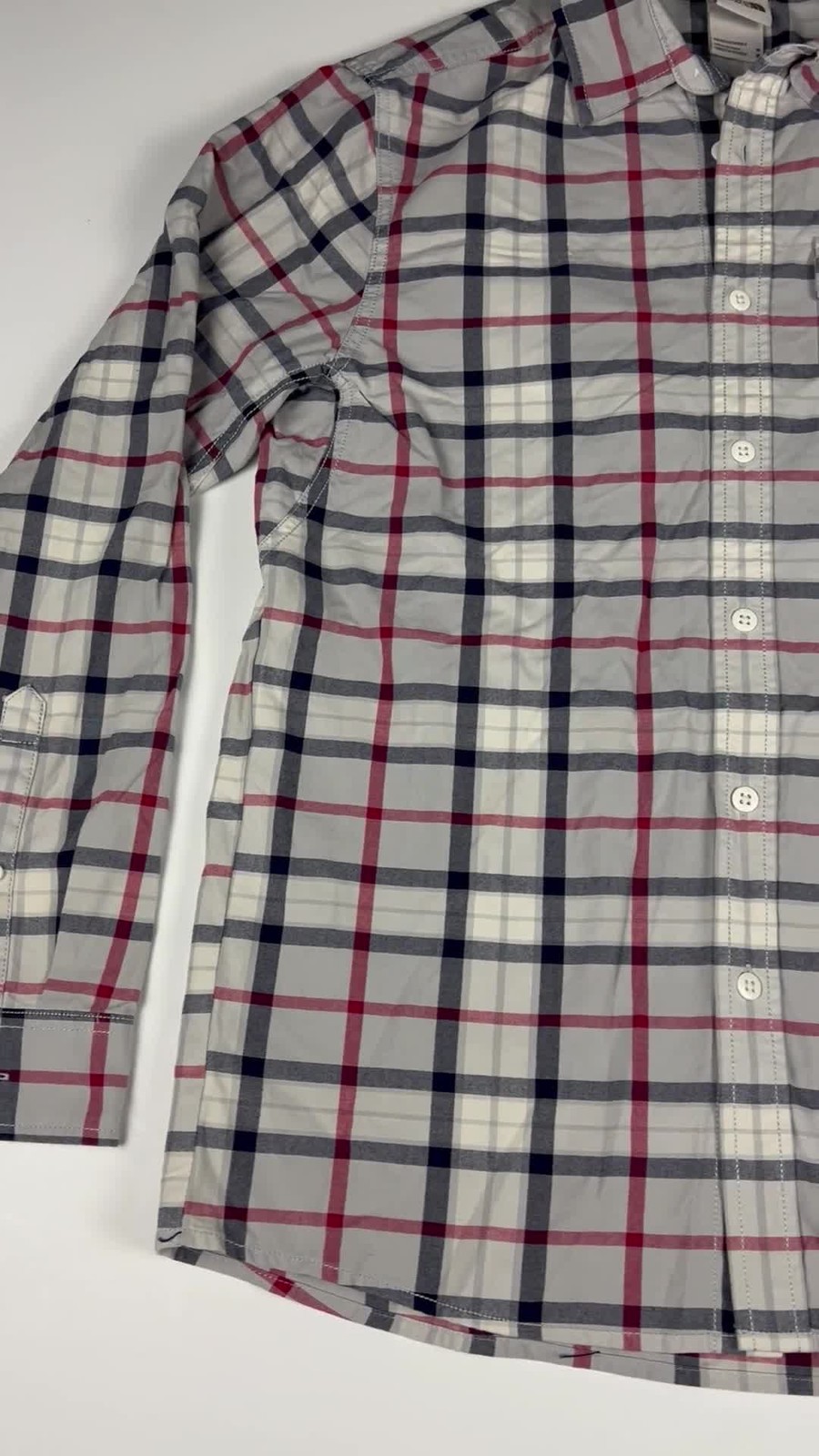A versatile essential arrives in the form of this The North Face button-up shirt, ready to enhance your casual wardrobe. Its classic plaid pattern, a harmonious blend of grey, navy, and red, offers a timeless appeal, while the long sleeves provide adaptability for year-round wear. Note the practical chest pocket for small essentials and the tailored fit that ensures a flattering silhouette. Envision it as your go-to for weekend outings, casual office environments, or relaxed evenings. Sleeve Length: Long Sleeve Department: Men Color: Gray Closure: Button Accents: Button Fabric Type: Woven Pattern: Plaid Material: Cotton Fit: Regular Collar Style: Button-Down Type: Button-Up Character: Retro, Classic Features: Pockets, Breathable Neckline: Collared Keywords: The North Face shirt, mens plaid shirt, long sleeve button down shirt, casual shirt, outdoor shirt, mens medium shirt, TNF, button up, plaid, checked, grey, red, navy, medium, classic
