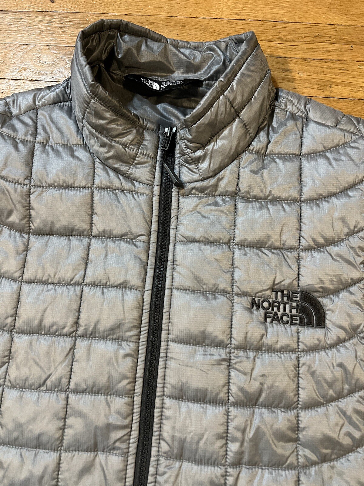 This is a men's The North Face Thermoball Vest in size small, featuring a gray solid color with a quilted design. The vest is made of nylon outer shell material and lined with nylon, suitable for travel, casual, or workwear occasions. With a mid-length and regular fit, this puffer jacket style vest includes insulation made of polyester for warmth during winter, fall, or spring outdoor activities like walking, skiing, or hiking. The garment care instructions indicate it is machine washable, making it convenient for everyday wear.