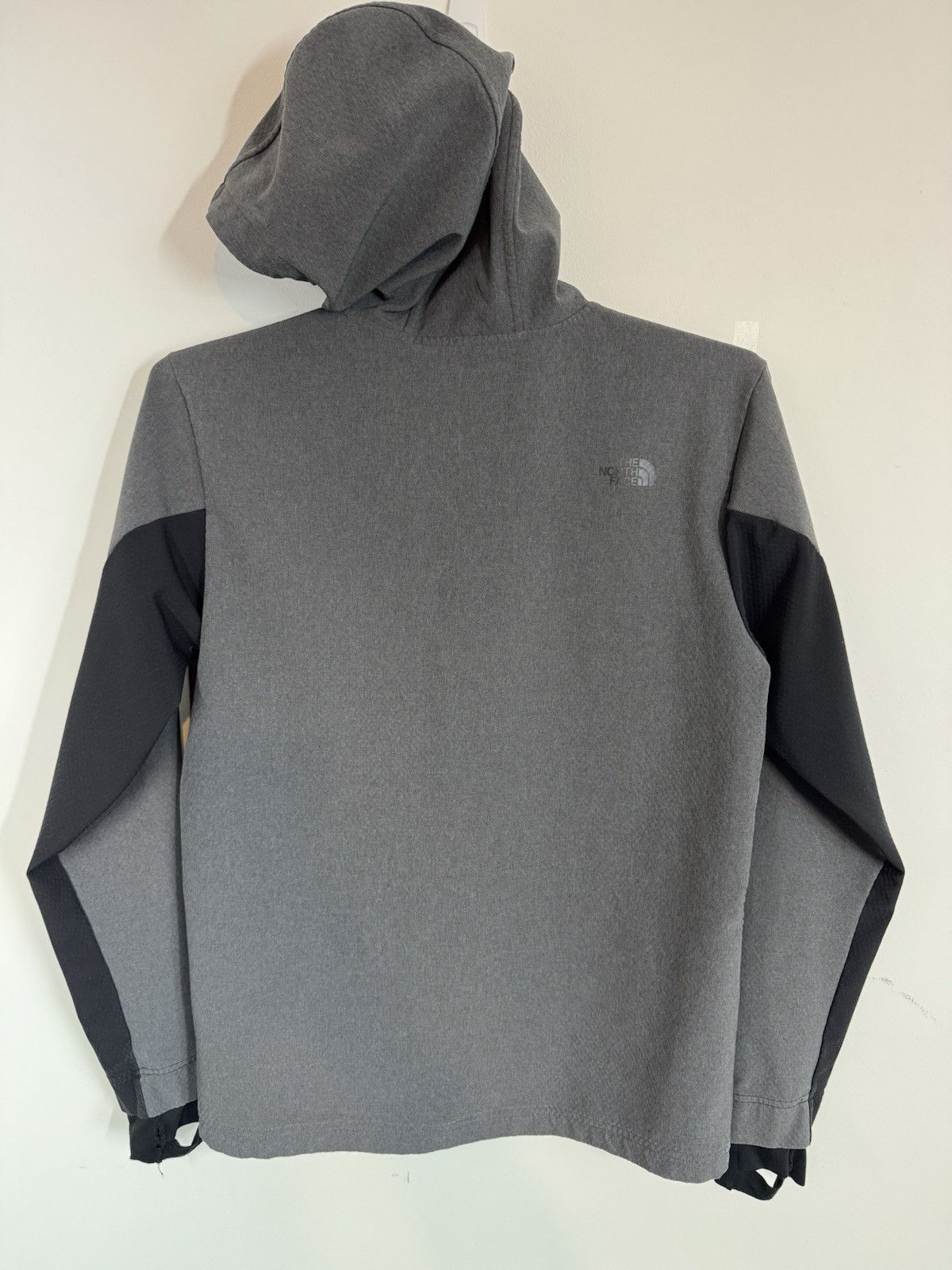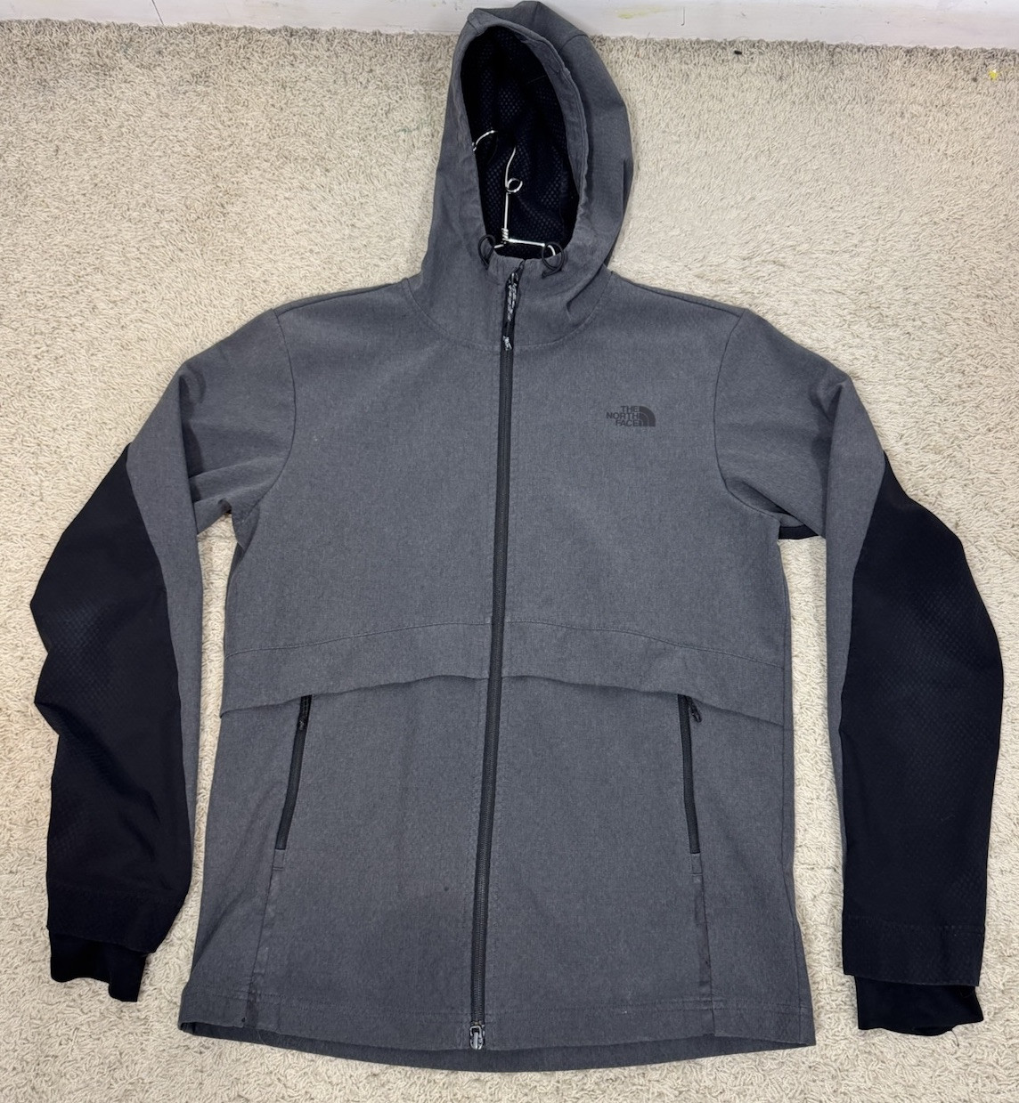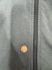 Good condition with 3 minor flaws please look at the last 3 pics 1. The one with the penny is a small spot that may or may not come out 2. The second one is a little wear marks near by the center seam very small 3. The coat has thumb holes and they are stretched out No other flaws stains or odors Fast ship