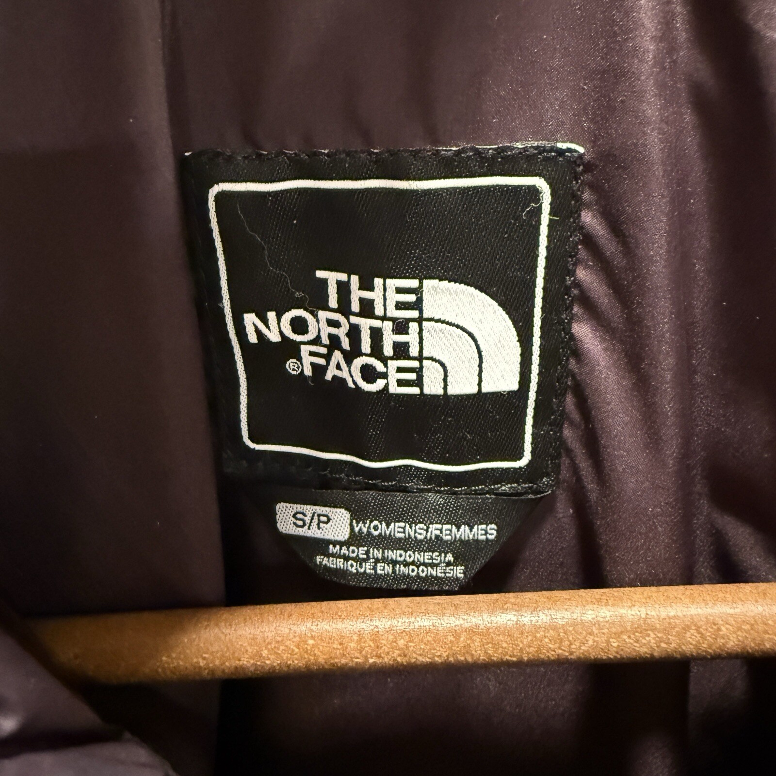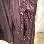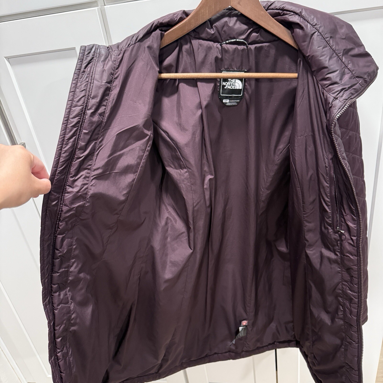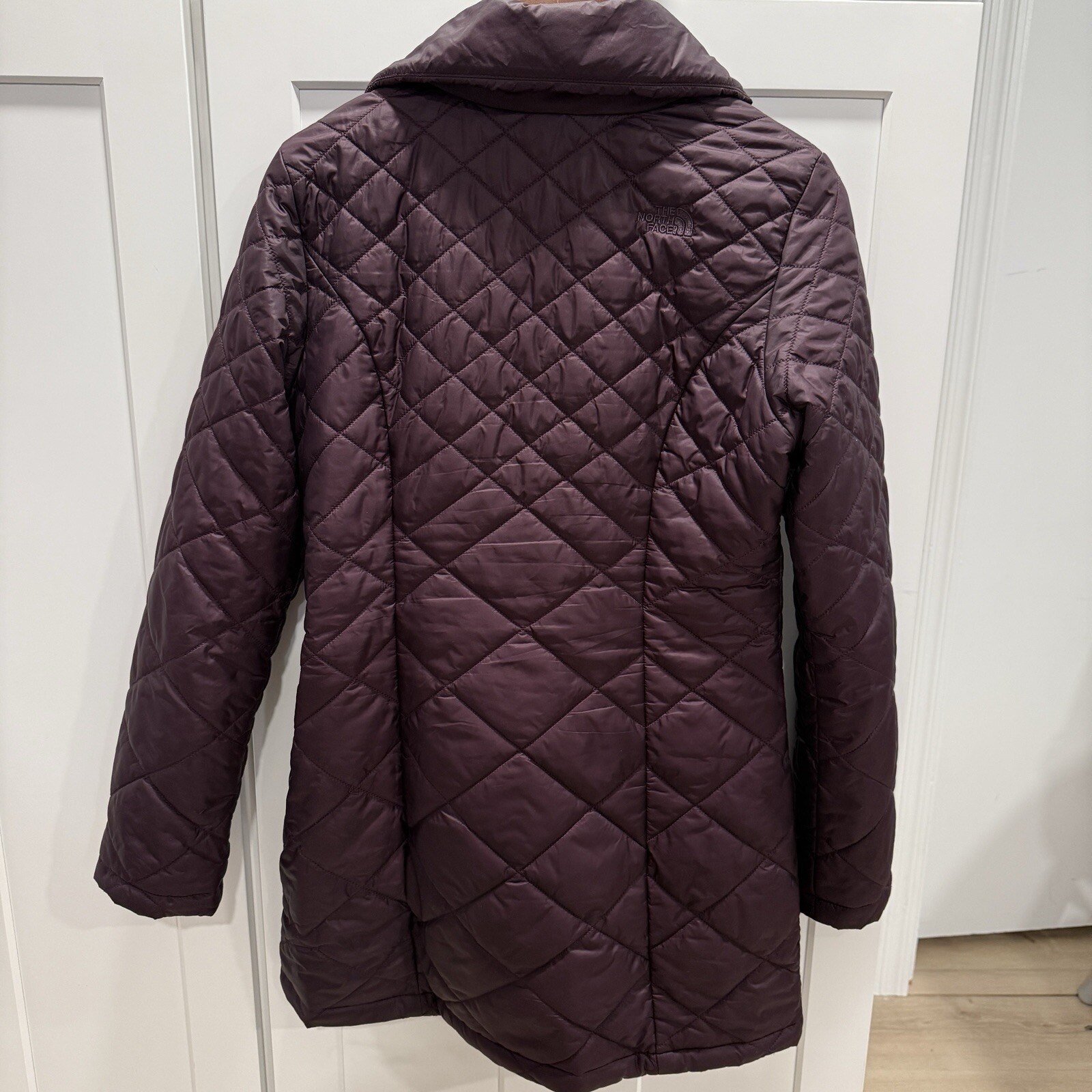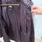 This is a women's long purple puffer coat by The North Face in size Small. The jacket is made of nylon with a quilted design and features a regular fit. It is designed with a waist-cinching feature and a stylish yet practical look for colder weather.