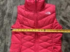 The North Face Puffer Vest Jacket in pink for women, size small, is made with 550 Goose Down insulation providing warmth and comfort. This mid-length jacket features a full zip closure, making it easy to layer over other clothing. With a soft polyester outer shell and soft shell fabric type, this jacket is lightweight and suitable for all seasons, perfect for outdoor activities or casual wear. The quilted design, embroidered logo accents, and convenient pockets add both style and functionality to this classic and versatile piece from The North Face.