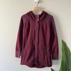 This red utility jacket features a practical hood and a tunic-style length, offering a relaxed fit perfect for layering in mild weather. Crafted from a soft material, it combines comfort with a casual style. Condition: Good pre-owned condition with small, unnoticeable discoloration on back right sleeve cuff (see photo). Comes from a smoke-free and pet-free home. Approximate Measurements (Lying Flat): Length: 27 in Chest: 18.5 in Waist: 16.5 in Sleeve Length: 22 in For seller use: 2lb 2117