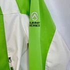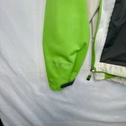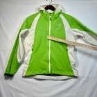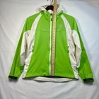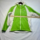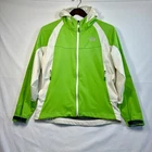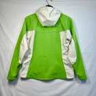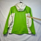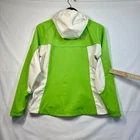 This North Face women's jacket is perfect for any occasion. It is made of softshell polyester and has a full zip closure with zipped pockets. The jacket is lightweight, breathable, and water-resistant, making it ideal for all seasons. The jacket is green in color and has an embroidered logo with a classic and preppy design, suitable for college and outdoor activities. The North Face Summit Series Windstopper Zip Up Hooded Jacket is machine washable and has a regular fit. It is a basic jacket that is perfect for travel, parties, and casual business meetings. A couple small stains on jacket, see last three pics