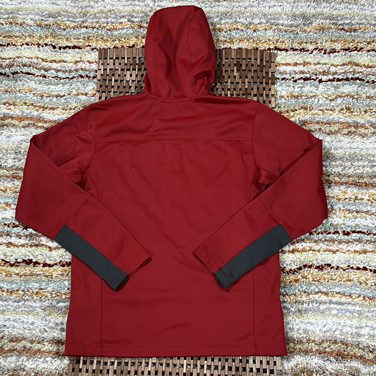 This is a red The North Face Tech Fleece Hoodie Jacket in size M for men. It features a solid pattern, zip closure, and polyester lining. The fleece material provides warmth, making it suitable for winter, fall, and spring. The jacket has a military style with accents like a zipper, embroidered logo, and pockets. It is ideal for outdoor activities like walking, hiking, and gym training, as well as for travel, casual wear, and workwear.