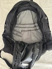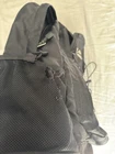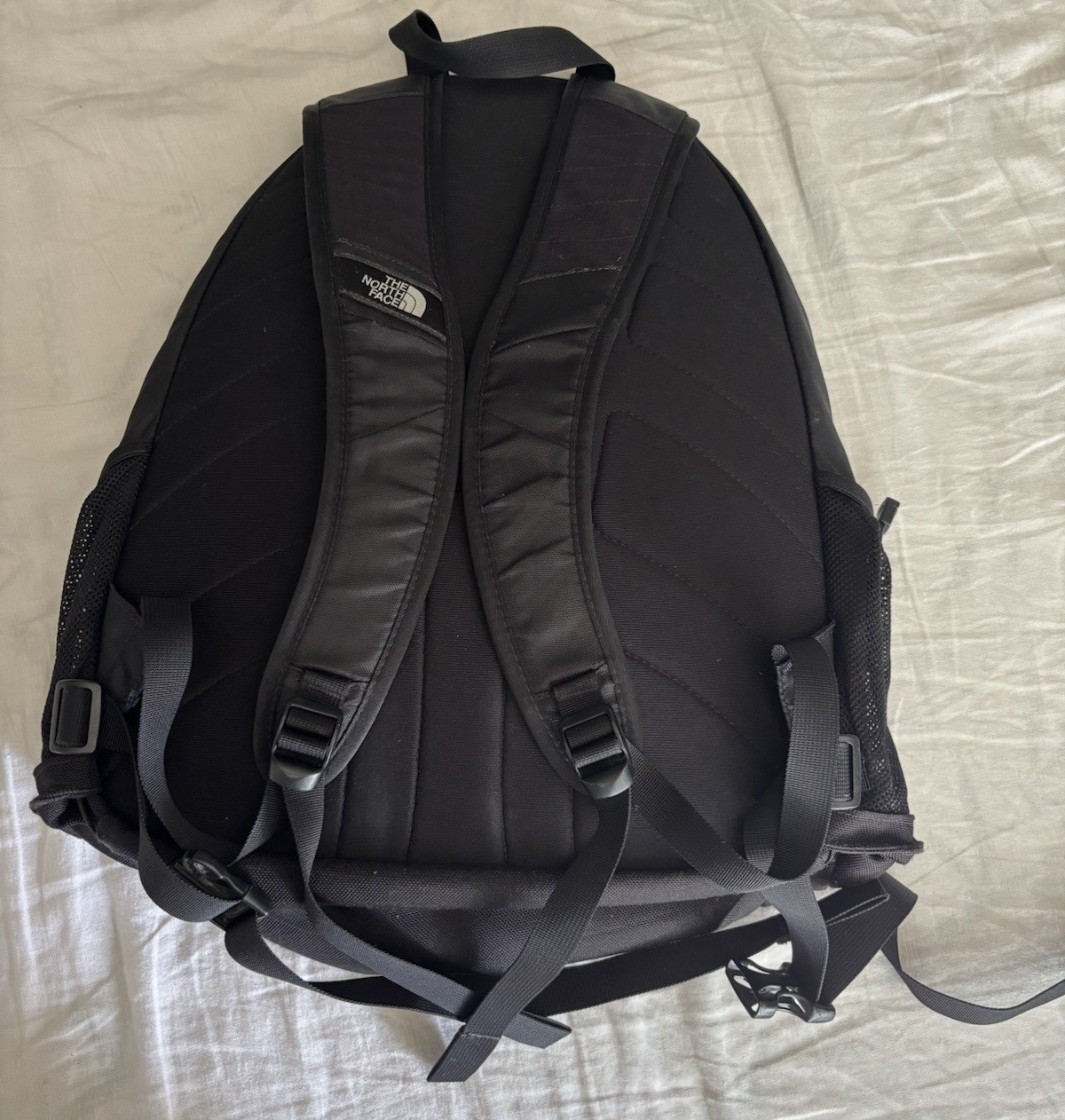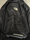 The North Face Unisex Jester Backpack in TNF Black is a medium-sized backpack designed for travel and casual occasions. It features a zip and buckle closure, a lined interior with a laptop sleeve and pockets, including a bottle pocket. Made of polyester fabric with a rayon lining, this backpack has a solid black color with a top handle style and stainless steel hardware. The North Face brand ensures durability and quality, making it a reliable choice for unisex adults on the go. Backpack is in good condition, just side pocket is ripped. All flaws will be shown. If you have any questions please ask. Thank you