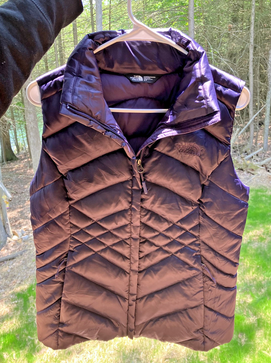 The North Face 550 Women's small Goose Down Quilted Puffer Vest is a stylish and practical outdoor garment designed for women. Made with a durable polyester outer shell and lined with cozy polyester, this vest is insulated with warm down to keep you comfortable in chilly weather. The quilted design and puffer style add a fashionable touch, while features like a full zip, lightweight construction, and pockets make it functional for outdoor activities. Perfect for layering or wearing on its own, this vest is a versatile addition to any woman's wardrobe. Photo colors vary due to sunlight.