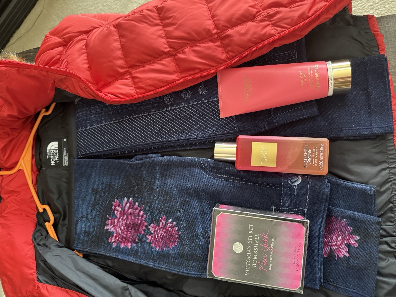 This North Face Women's Red Down Puffer Jacket is a stylish and functional winter essential. The jacket features a faux fur hood, zip closure, and quilted design, making it perfect for casual occasions in the colder seasons. With a mid-length cut and 550 fill power down insulation, it provides warmth and comfort while still maintaining a trendy look. The polyester outer shell and nylon lining ensure durability and weather resistance, making it ideal for outdoor activities like skiing or streetwear fashion. Including Victoria secrets Bombshell perfume, fragrance lotion, and mist. 2 pairs of designer stretch jeans included one size fits all.