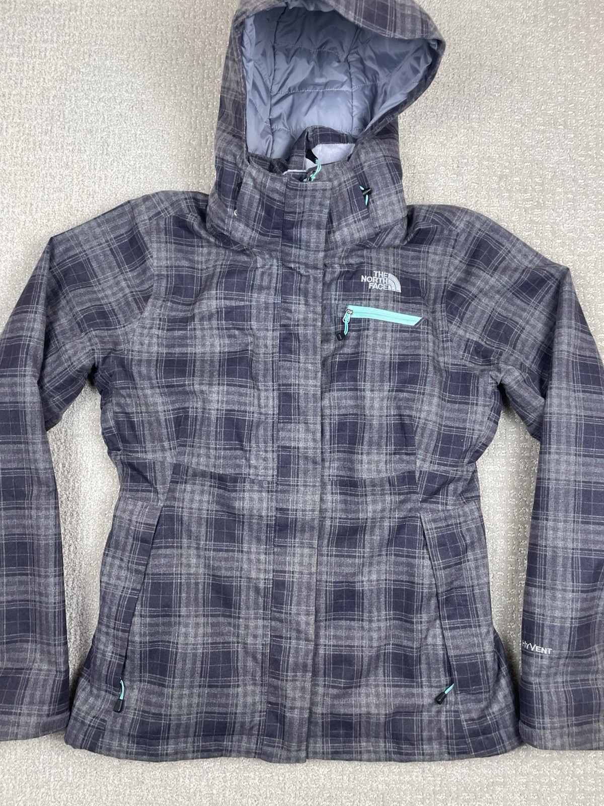 Note the small hole in the right elbow, see the closeup photos - only goes through the outermost layer. Embrace the slopes with The North Face Men's Ski Jacket in a sleek black and gray plaid design. This hooded parka, crafted for comfort and durability, features a waterproof exterior, thanks to its Hyvent technology, ensuring you stay dry even in the wettest conditions. The softshell fabric provides a balance of flexibility and protection, perfect for active movement during skiing. Equipped for the winter season, the jacket includes synthetic insulation to maintain warmth without the bulk. With practical accents like a logo emblem and button details, this regular fit, size large jacket offers both style and functionality for the outdoor enthusiast. Whether you're carving down the mountain or enjoying the après-ski scene, this jacket is designed to keep you cozy and stylish.