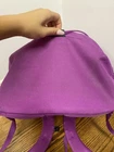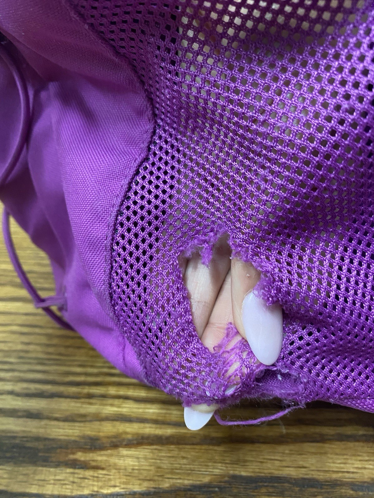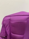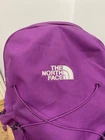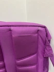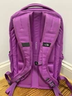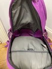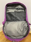 pre- owned jester backpack. magenta color. has some discoloration from use. the bottom has dark spots from wear. side pocket has hole but is still usable. one zipper pull is missing the rubber cover but is still usable. all other wear is shown in photos. OFFERS WELCOME!