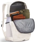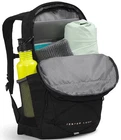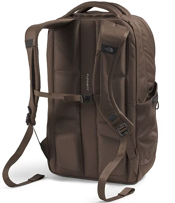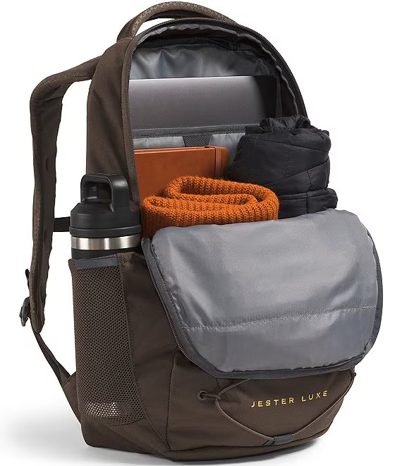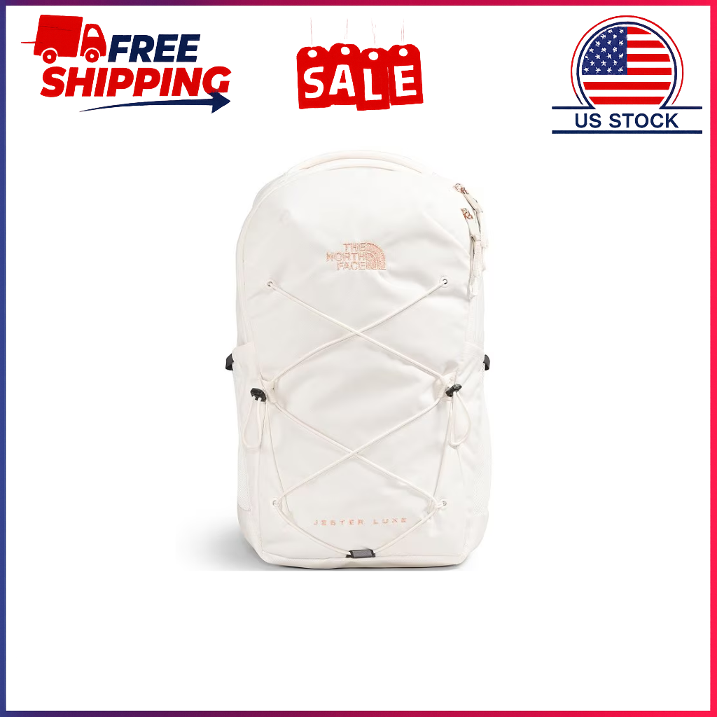 From The North Face, the Women's Jester Luxe FlexVent Backpack features: Premium metallic embroidered logo and metallic zipper pulls Two webbing top handles Pack stands on its own for easy loading and unloading Padded 16'' laptop sleeve Huge main compartment holds books and binders for a day on campus Secure-zip pockets, a tablet sleeve and a key clip Two external water bottle pockets Stylish front bungee system for additional storage 360-degree reflectivity Sternum strap Laptop sleeve approx. 12.75'' x 11'' (32.4 cm x 27.9 cm) Approx. 11'' x 6.75'' x 17.25'' (27.9 cm x 17.1 cm x 43.8 cm) Average weight approx. 1 lb 8 oz (680 g) Volume approx. 1647 in³ (27 Liters)