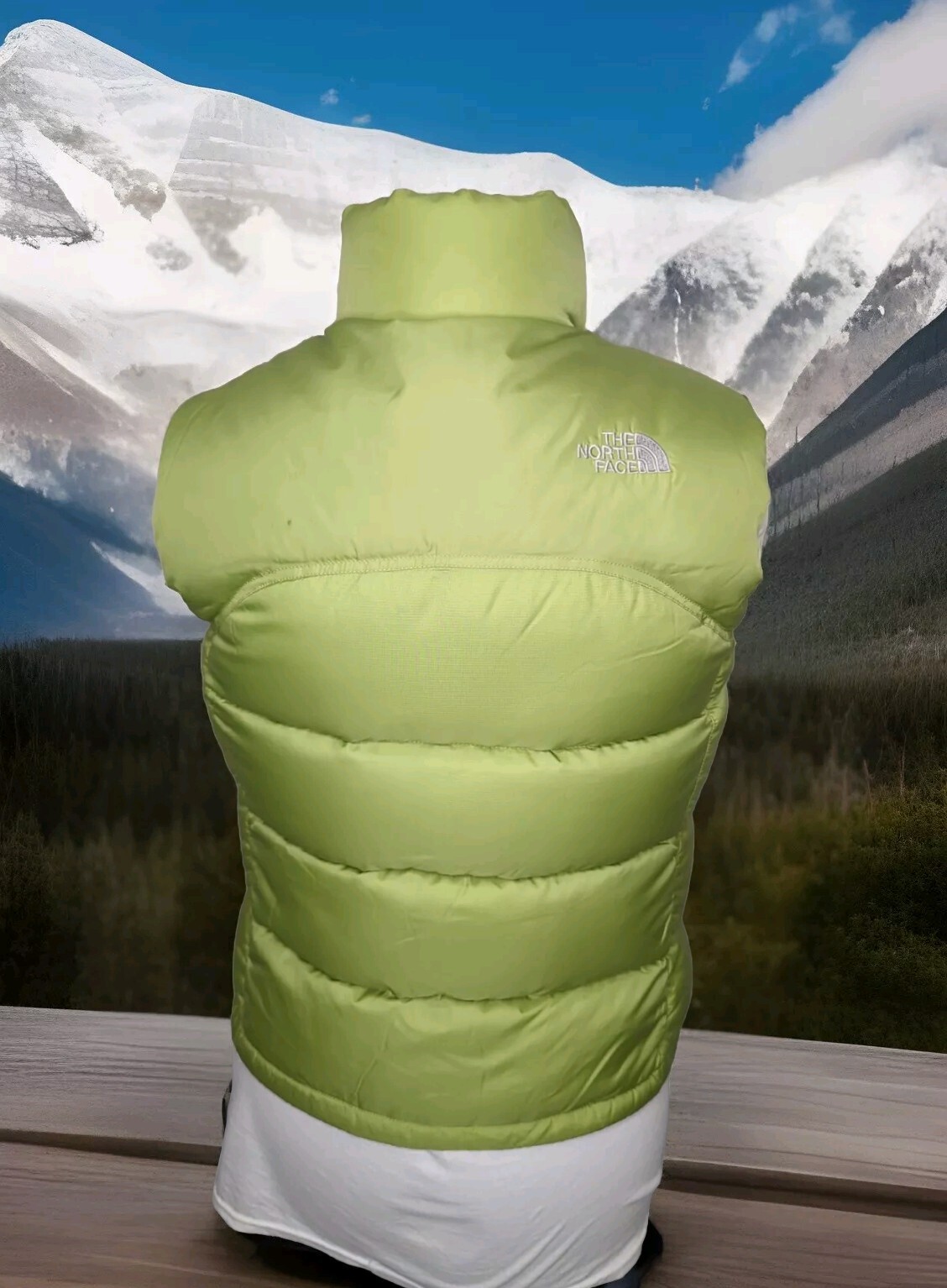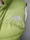 CLASSIC THE NORTH FACE NUPTSE DOWN PUFFER VEST JACKET 700 FILL POWER GOOSE DOWN INSULATION LIGHT GREEN IN COLOR EMBROIDERED NORTH FACE LOGO ON FRONT AND BACK ZIPPERED HAND POCKETS WOMENS SIZE SMALL 20" ACROSS EXTERIOR CHEST LAID FLAT 25" LENGTH TOP OF SHOULDER TO HEM