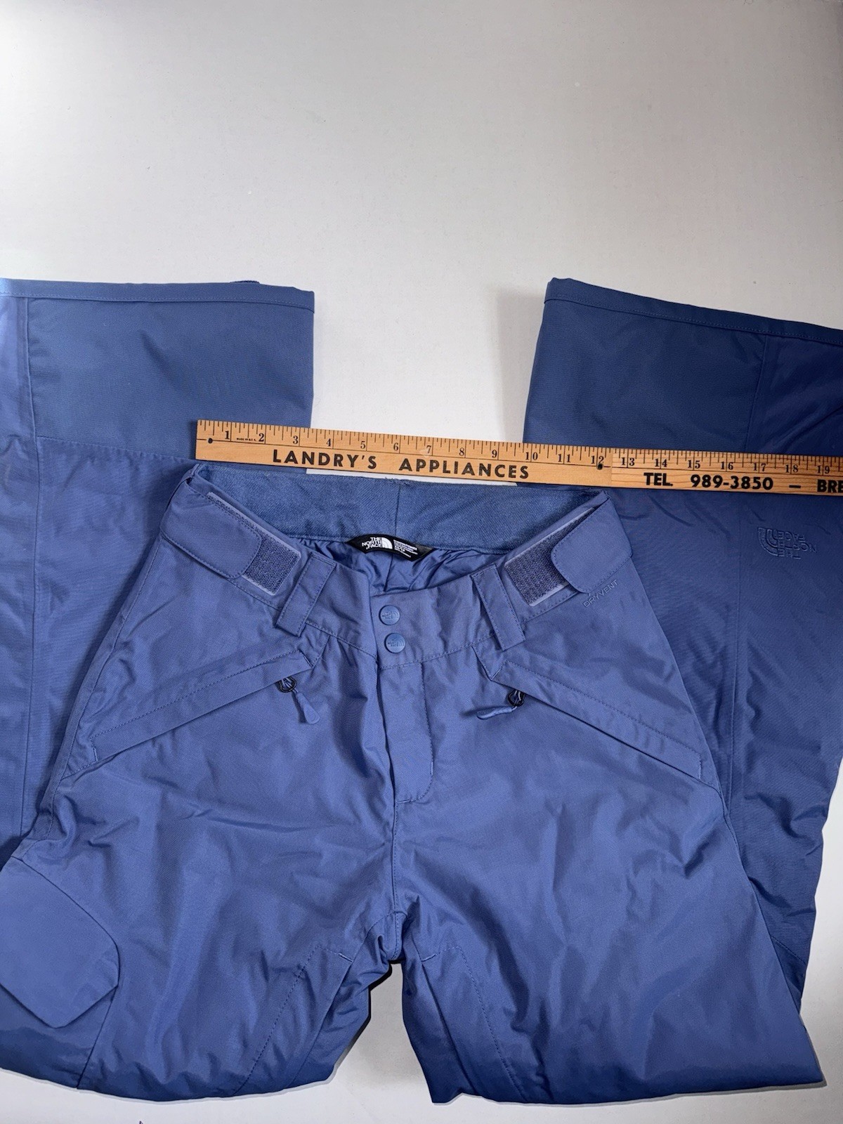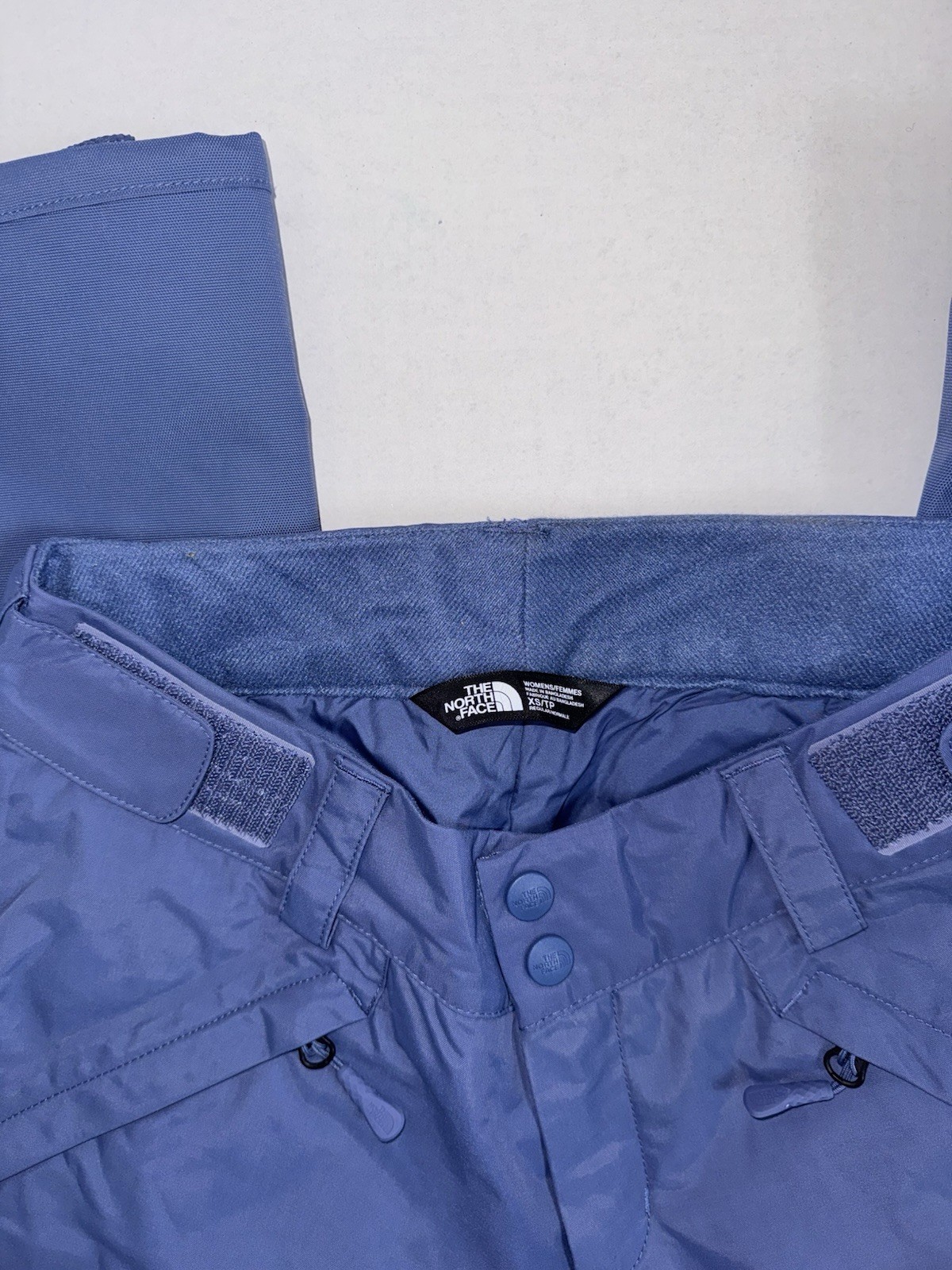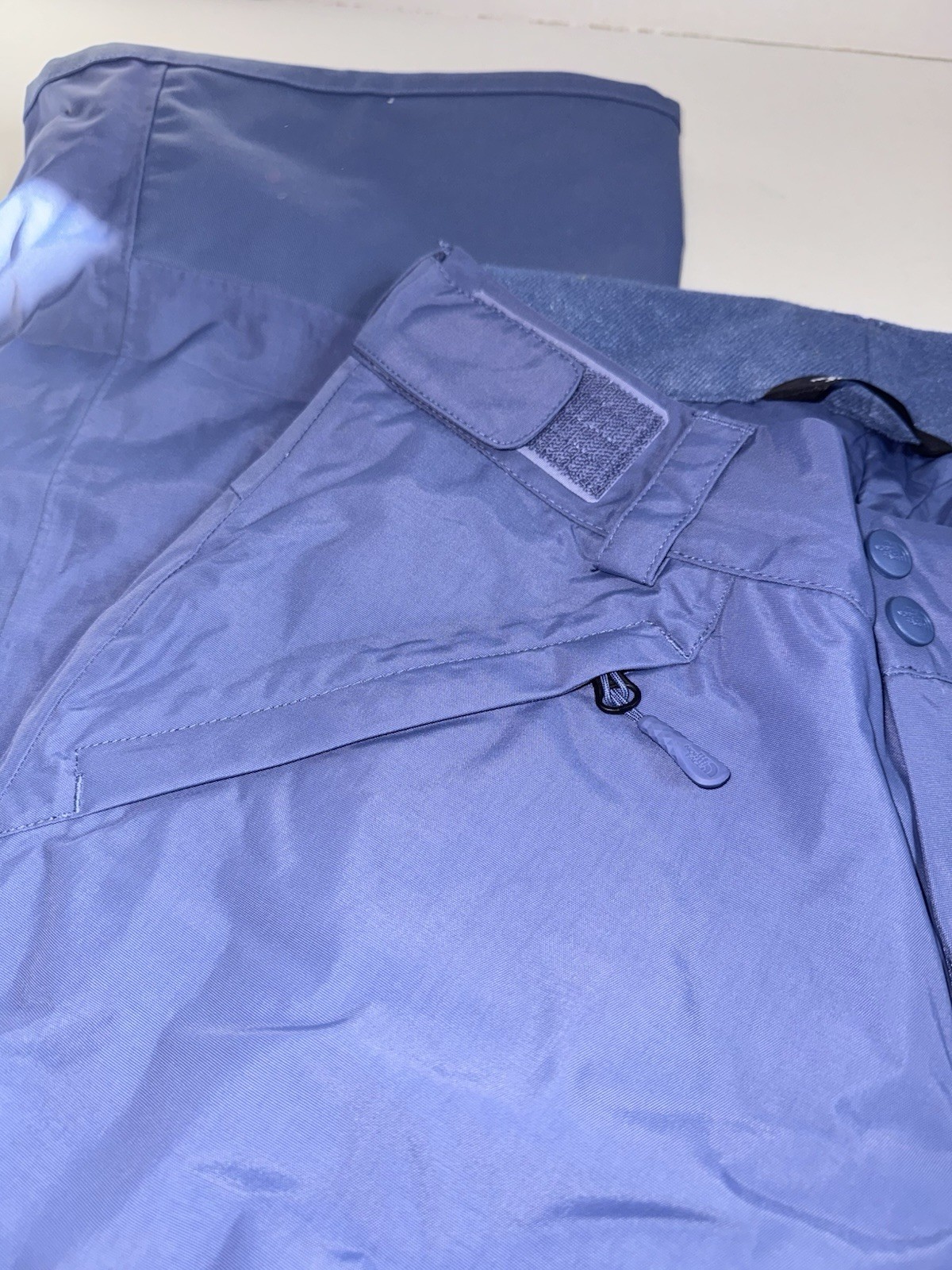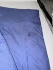The North Face vented ski snow pants in a unique blue/purple color. The pants are an XS, waist size pictured and leg length from hip to hem is 39”. These pants are adjustable at the waist by 3 inches with a Velcro panel on each hip. These also include a leg vent that can be unzipped on the inner thigh of each leg.