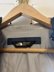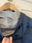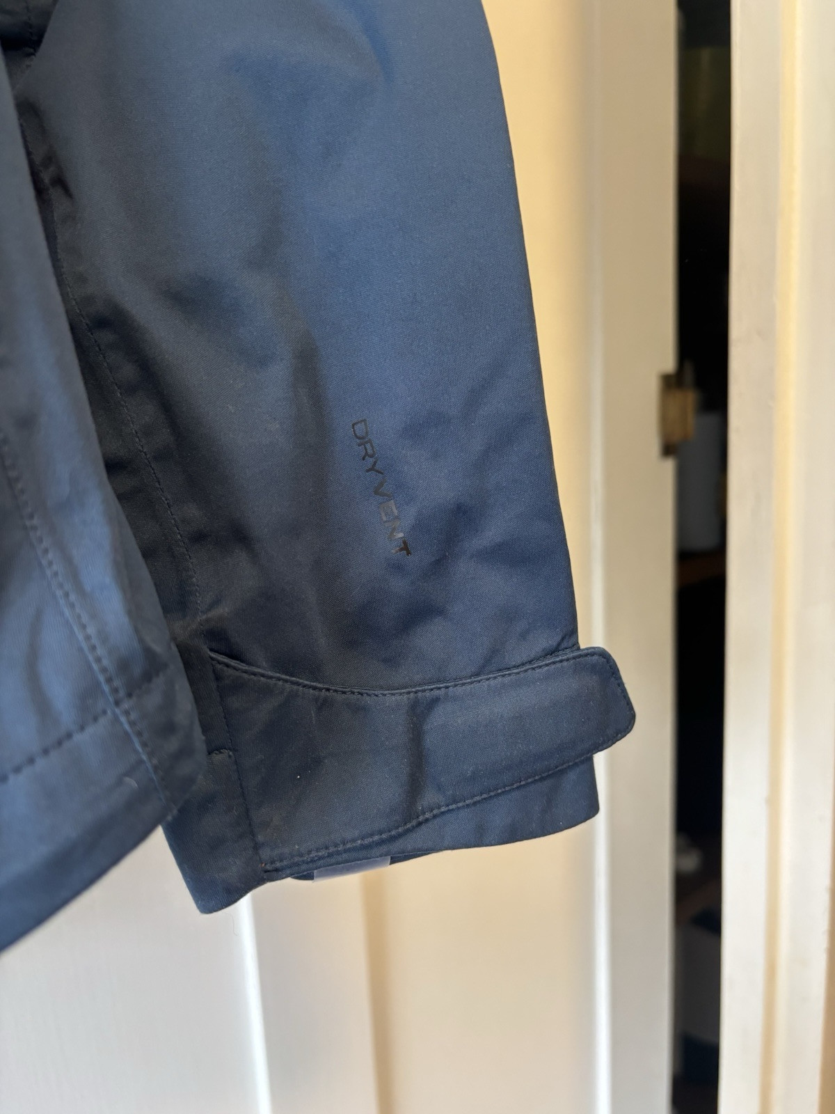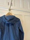 This pre-owned The North Face rain jacket in size XS is in excellent condition. It is made of polyester in a solid dark blue color, it features long sleeves, a zipper closure, and accents like zipped pockets and a logo. Designed for outdoor activities, this lightweight jacket is suitable for all seasons. It has Velcro to tighten the wrist area. It also has zippers in the underarm for ventilation.