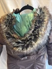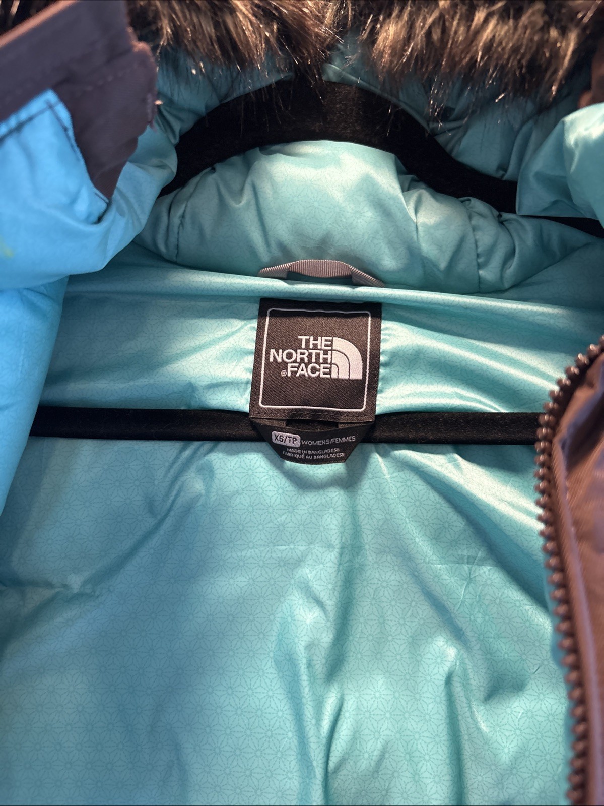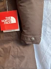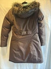 The North Face Down Parka Jacket in women's extra small size features a stylish brown color with a furry hood for added warmth and protection. Made with a durable nylon outer shell and insulated with cozy down material, this jacket is perfect for colder weather. The parka style and hooded design make it both functional and fashionable, ideal for outdoor activities or everyday wear.