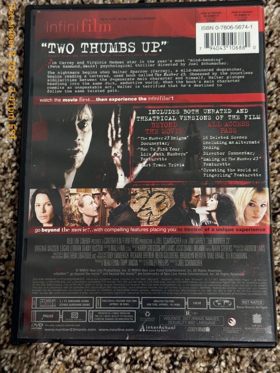 The Number 23 – Unrated Infinifilm Edition (DVD) Starring Jim Carrey Condition: USED – Good Description: This listing is for the The Number 23 Unrated Infinifilm Edition DVD, starring Jim Carrey. The disc is in Good pre-owned condition with light surface wear that does not affect playback. Case and artwork show normal shelf wear. This psychological thriller follows a man who becomes obsessed with a mysterious book that eerily mirrors his own life, leading him down a dark path of obsession and revelation. The Unrated Infinifilm Edition includes additional features for a more in-depth viewing experience. Features: – Unrated Infinifilm Edition – Starring Jim Carrey – Original case and artwork included – Disc tested and fully functional Shipping: Item will be carefully packaged and shipped promptly.